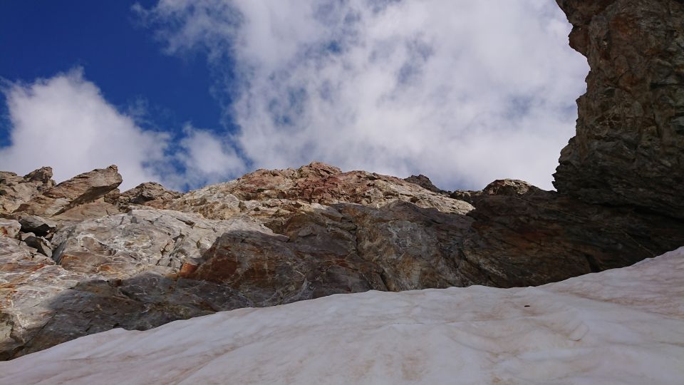 Direktvariante nicht mehr möglich. Variante (rechts in eine Verschneidung und anschliessende Querung von rechts nach links zur Ausstiegsrinne auf den SW-Grat) geht gut, aber die ersten Meter vom Firn über die Felsen am Fixseil sind steil und schlifrig ?