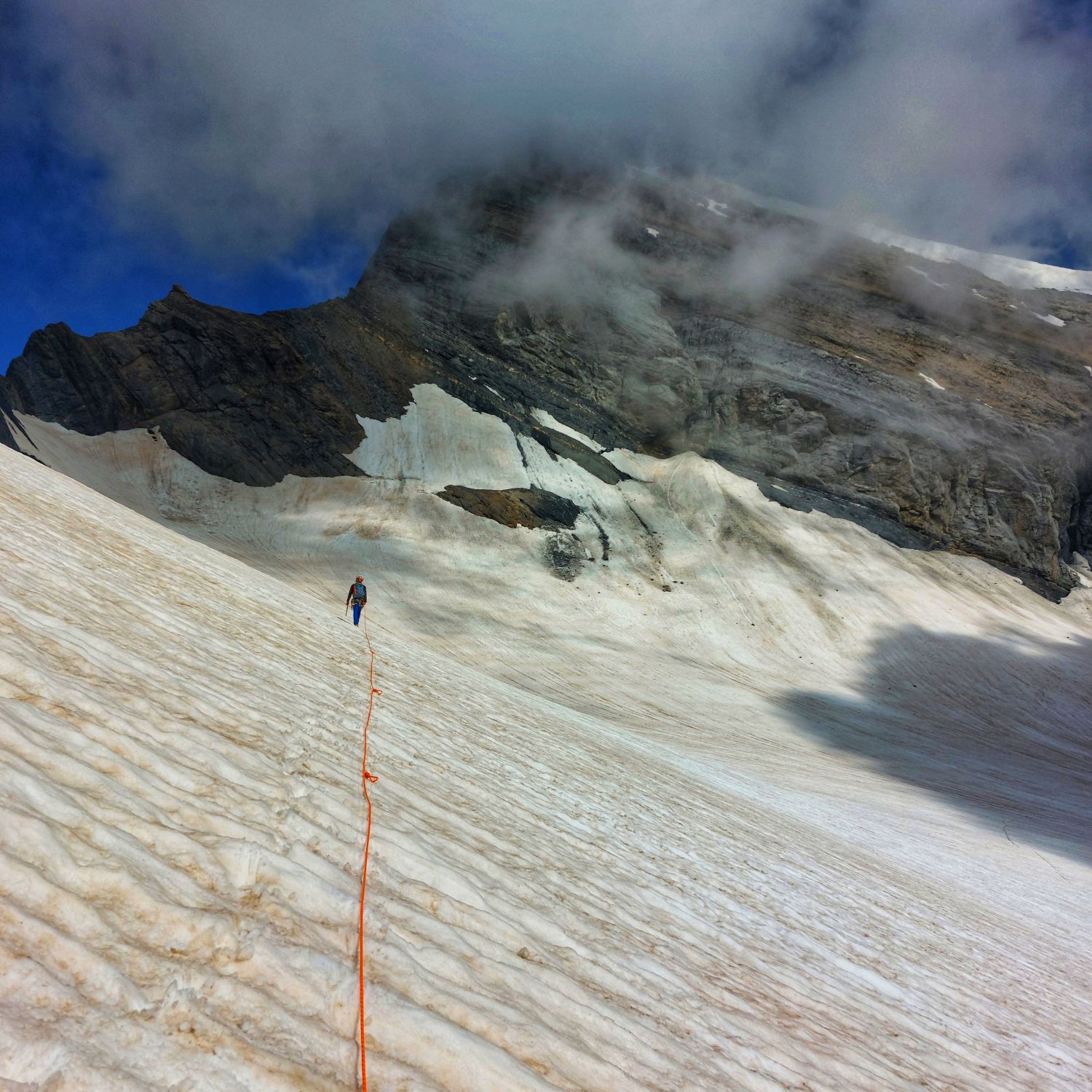 Abstieg ab Bifertenstock bis zum Einstieg Kette über den Grat meist schneefrei, Ketten schneefrei und alle Übergänge problemlos zu machen. Wenige Altschneefelder im Bänderweg können problemlos unterhalb passiert werden. Route Eisnase sieht noch gut aus und kann noch ohne Blankeis begangen werden. Bergschrund beim Einstieg nicht richtig gesehen von oben. Abstieg ab Bifertenhütte ins Val Frisal aud der auf der SAc App eingezeichneten T5 Route ist die Wegfindung nicht ganz einfach und die auf der Karte eingezeichneten Wegspuren sind meist zugewachsen.
