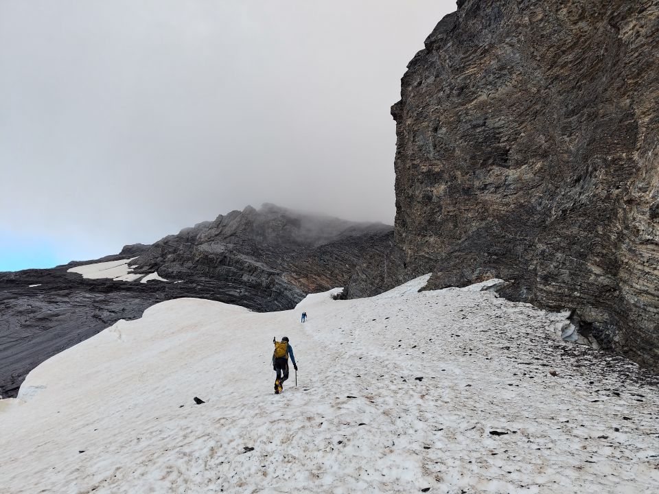 Bleibt sicher noch etwas länger gut. Die lange Spalte unterhalb des Gipfelhangs beginnt sich allerdings langsam zu öffnen.