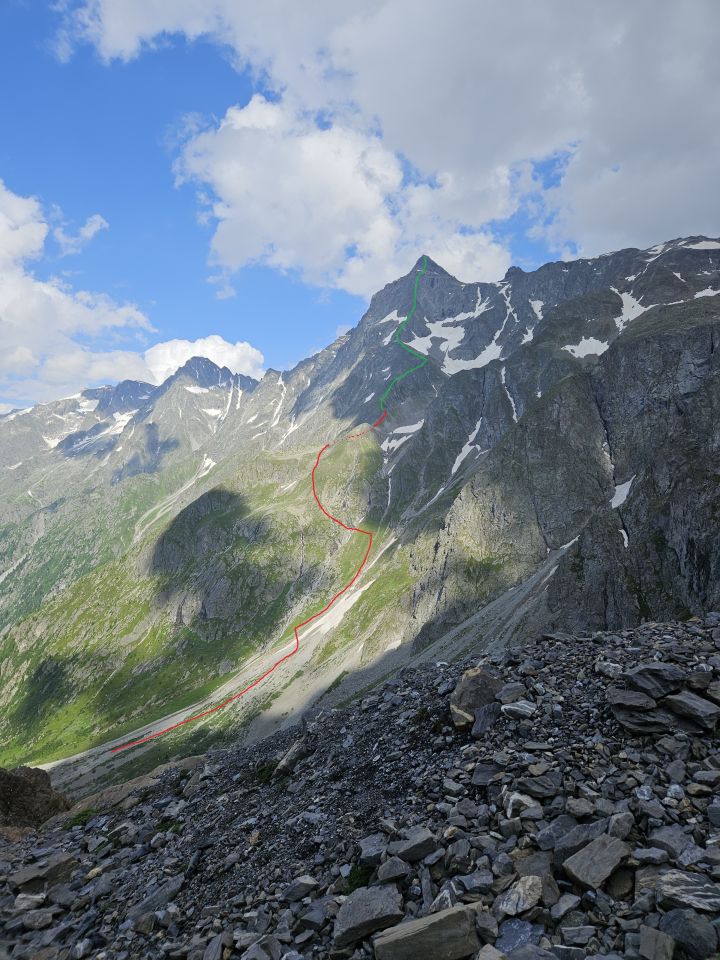 Ab Einstieg in den Grat benötigten wir 4 Stunden bis zum Gipfel. Wir haben uns soweit möglich auf dem festen Grat gehalten und wurden nur gelegentlich zum Ausweichen gezwungen. An einer Stelle ist vergleichsweise frisch ein grosser Fels ausgebrochen und an anderer Stelle endet der Grat abrupt und führt erst ein paar Meter senkrecht weiter unten fort.