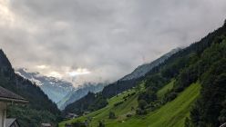 Start um 07:00, dichte Wolken oberhalb von 1800m, 18°C. Kurz nach dem Start kommt ein Schild, dass anzeigt, dass der normale Mountainbike-Weg durch Murgänge verlegt ist. Da aber der Wanderweg durch's Tal nicht gesperrt ist, folge ich diesem. In der Folge gibt es drei Stellen, wo der Weg durch Murgänge beschädigt wurde, aber alle drei sind bereits wieder zumindest behelfsmäßig instandgesetzt, so dass ein Durchkommen kein Problem ist.