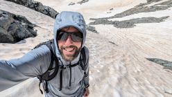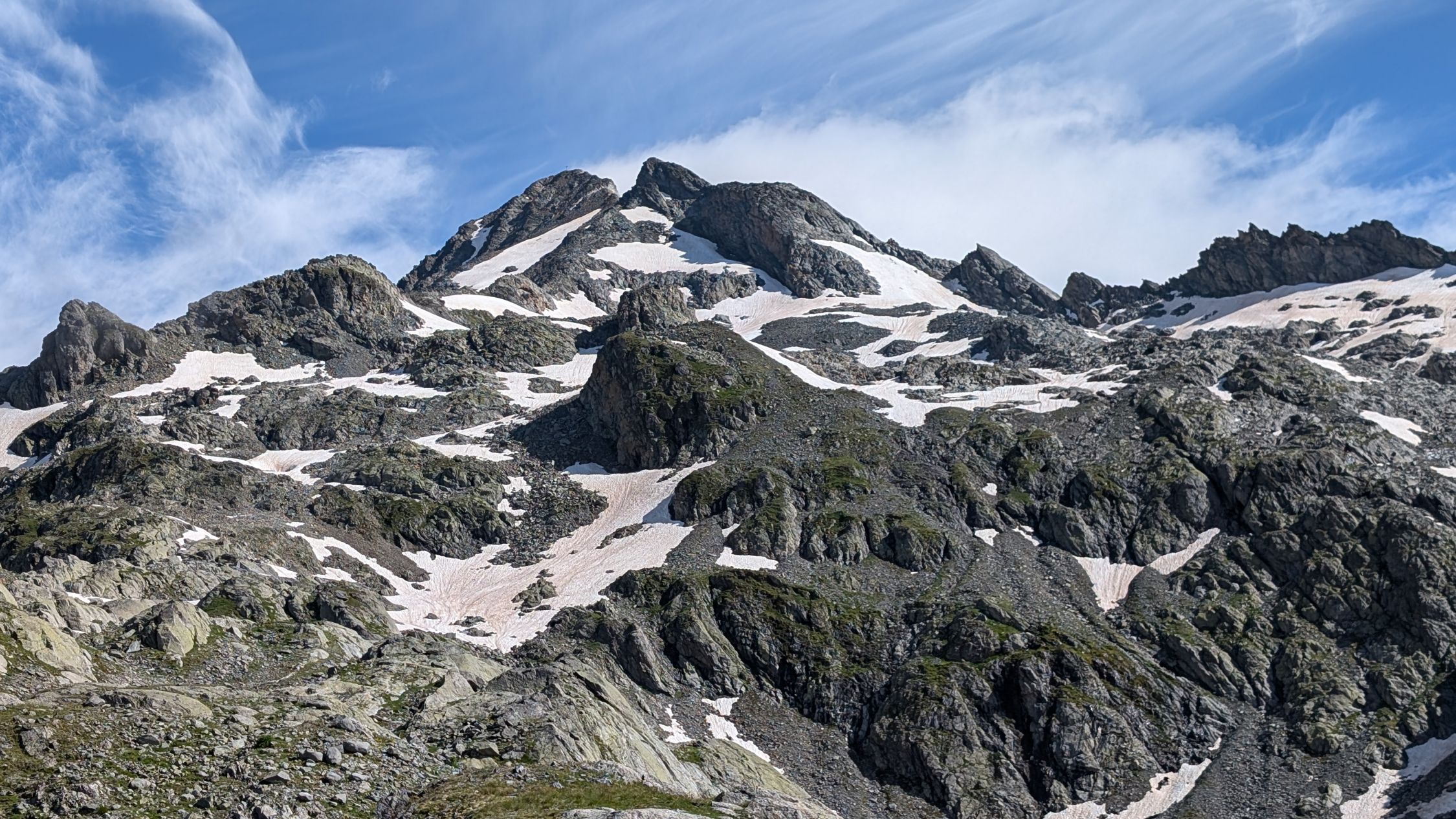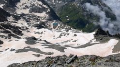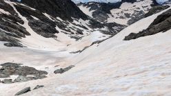 Ab Tschingelsee folge ich zuerst dem Rücken Richtung Norden bis etwa 2.600m und quere dann zur Schulter nördlich von P. 2.717. Ab hier kann man durchgehend auf Schnee bis zum Einstieg des Grates gelangen, aber wahrscheinlich nur noch wenige Tage. Ich wähle einen sehr direkten Weg über ein schmales, bis etwa 45° steiles Schneeband. Für dieses montiere ich die Steigeisen. Geht man über einen flacheren, längeren Weg, sind sie aber nicht notwendig. Einen Pickel hatte ich nicht dabei, ohne Steigeisen wäre er aber nicht überflüssig gewesen, um bei einem Rutscher rasch bremsen zu können.