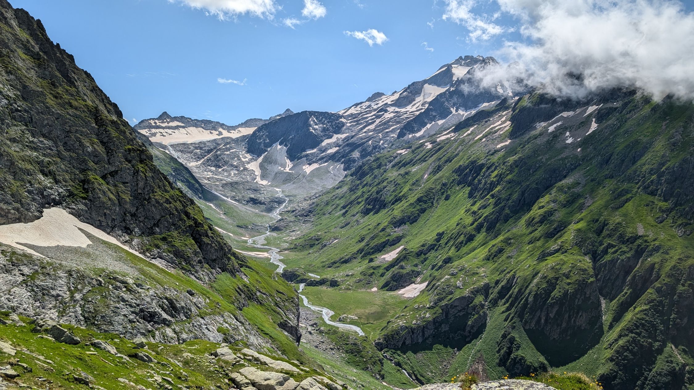 Nach knapp zwei Stunden erreiche ich Hinterbalm; die Wolken sind sogar noch dicher geworden, und ich beschäftige mich langsam mit einem Plan B. Am Abzweig zum Tschingelsee auf 1900m lichten sich die Wolken endlich, rasch wird es klar. Der Weg zum Tschingelsee ist gut zu finden, aber im unteren Teil sehr nass und rutschig. Für mich de facto der anstrengenste Teil der Tour heute.