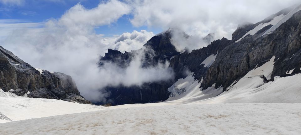 Nun weiter erst eine halbe Stunde flach den Spuren folgend langsam ansteigend nördlich, dann das große Schneefeld östlich (rechts) empor bis in die Porta da Gliems (hier etwa 100 m 35°). Die geschlossene Randkluft ermöglicht es, die Ketten gut zu erreichen. Die nächsten 100 Meter durch die nasse, brüchige Felswand stellen auf jeden Fall die Schlüsselstelle der Route dar, sind aber mit einer soliden Stahlkette gut gesichert. Vorsicht vor Steinschlag, selbst vorsichtige Kletterer bombardieren die Nachfolger mit unzähligen Steinen, besonders bei Nutzung eines Seils. Die Route ist zum Glück diagonal gelegt, so dass sich die Gefahr für die Unteren in Grenzen hält.