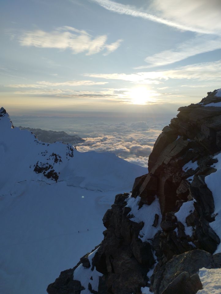 Bombastische Verhältnisse! Gletscher mit perfekter Schneeauflage, somit fast alle Spalten schön abgedeckt. Wir sind von Zermatt aus gestartet, und haben den Gipfel nach 2 Biwaks um 7:00 erreicht. Abseilen zum Silbersattel nicht sehr angenehm aber mit Geduld geht's. Wenn's dort Stau gibt wird allerdings ziemlich ungemütlich.. Im Anschluss noch einmal biwakiert, um am Tag 4 wieder nach Zermatt abzusteigen. Eine eindrückliche Reise mit spannender Fauna und Flora, vielen alpinen Ereignissen wie z.B. riesige Lawinenabgänge vom Liskamm oder wummende Gletscherspalten. Absolut phänomenal!
