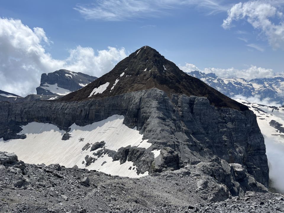 Schönes Wetter, leider etwas viele Quellwolken. Der N-Grat ist fast völlig trocken. Im Abstieg zur Musenalp noch angenehme Schneefelder bis gegen 2500 m.