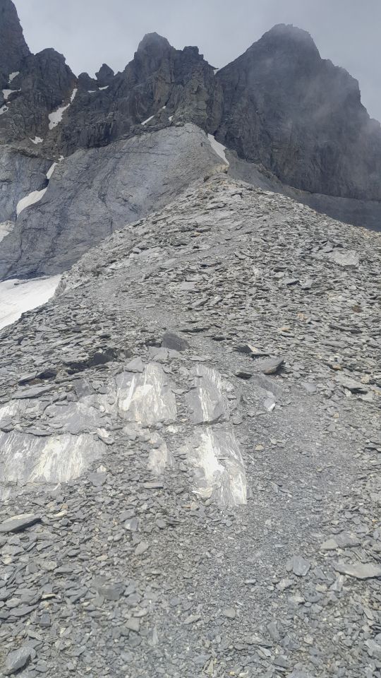 Schnee ab etwa 1700 m erleichtert den Aufstieg zum und vor allem Abstieg vom breiten Ausläufer des Mittelgrates. Wenn man dort wieder herunterkommt, kann man die Steigeisen und Pickel dort deponieren, im Nordhang unter dem Gipfelkopf gibt es keinen Schnee mehr.