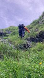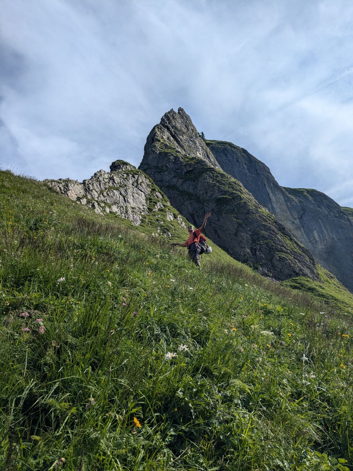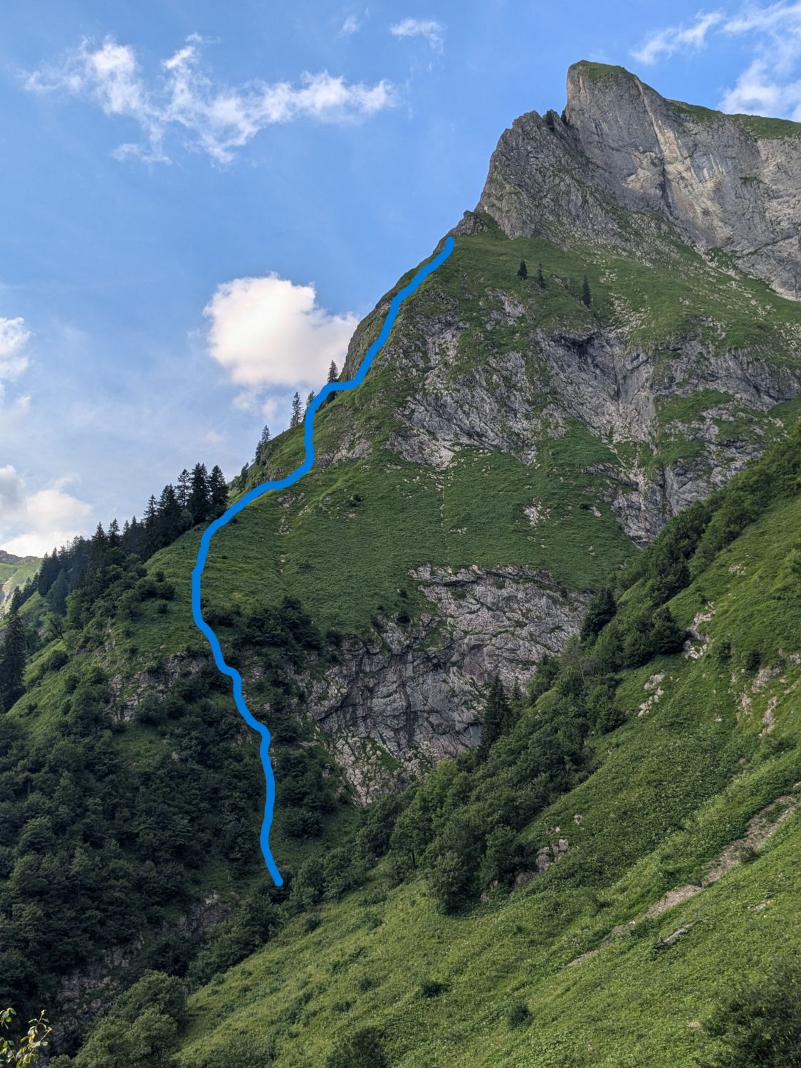 Es geht auch ohne detailierte Beschreibung. Wir sind immer gerade hoch oder auf der Schneide entlang (Grasflanke unten, Schrofenaufschwung nach den Fichten, unterer Felsgrat). Das Gelände ist links oder rechts dieser Linie auch nicht besser oder schlechter. Fehler dürften allerdings kaum verziehen werden ...