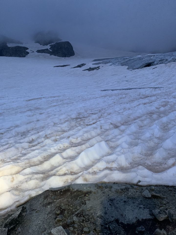 „Eine Kaltfront streift den Norden der Schweiz (…). Im Wallis recht sonnig.“ Soso… Um 3:30 Uhr Regen bei 12 Grad auf der Baltschiederklause. Start dann gegen 4:30 Uhr, der zügige Wind trocknete alles rasch ab. Der Wind blies bis gegen 9 Uhr zügig weiter, Gipfel oberhalb 3300 m in Wolken. Äusserer Baltschiedergletscher tragend, griffig, nicht gefroren. Keine Spalten bis zur Lücke 3475 m erkennbar. SSO-Grat Breitlauihorn trocken, schön zu klettern. „Gut“ aufgrund der mässigen Wetterbedingungen, sonst eher "ausgezeichnet".