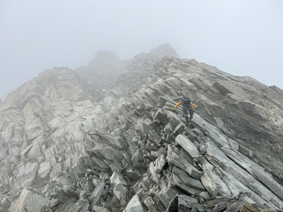 Wir sind aufgrund der schlechten Sicht nicht wie geplant über den (kurzen) Westgrat abgestiegen sondern über das brüchige Couloir, welches direkt auf den Äusseren Baltschiedergletscher hinabzieht. Das geht, ist aber nur bei einzelnen Seilschaften möglich - äusserst brüchiges Gelände. Bei offenen Bergschrund hat es eine improvisierte Abseilstelle - 30 m Seil ausreichend. Wir sind abgeklettert, der Bergschrund ist an einer Stelle gerade noch überschreitbar..