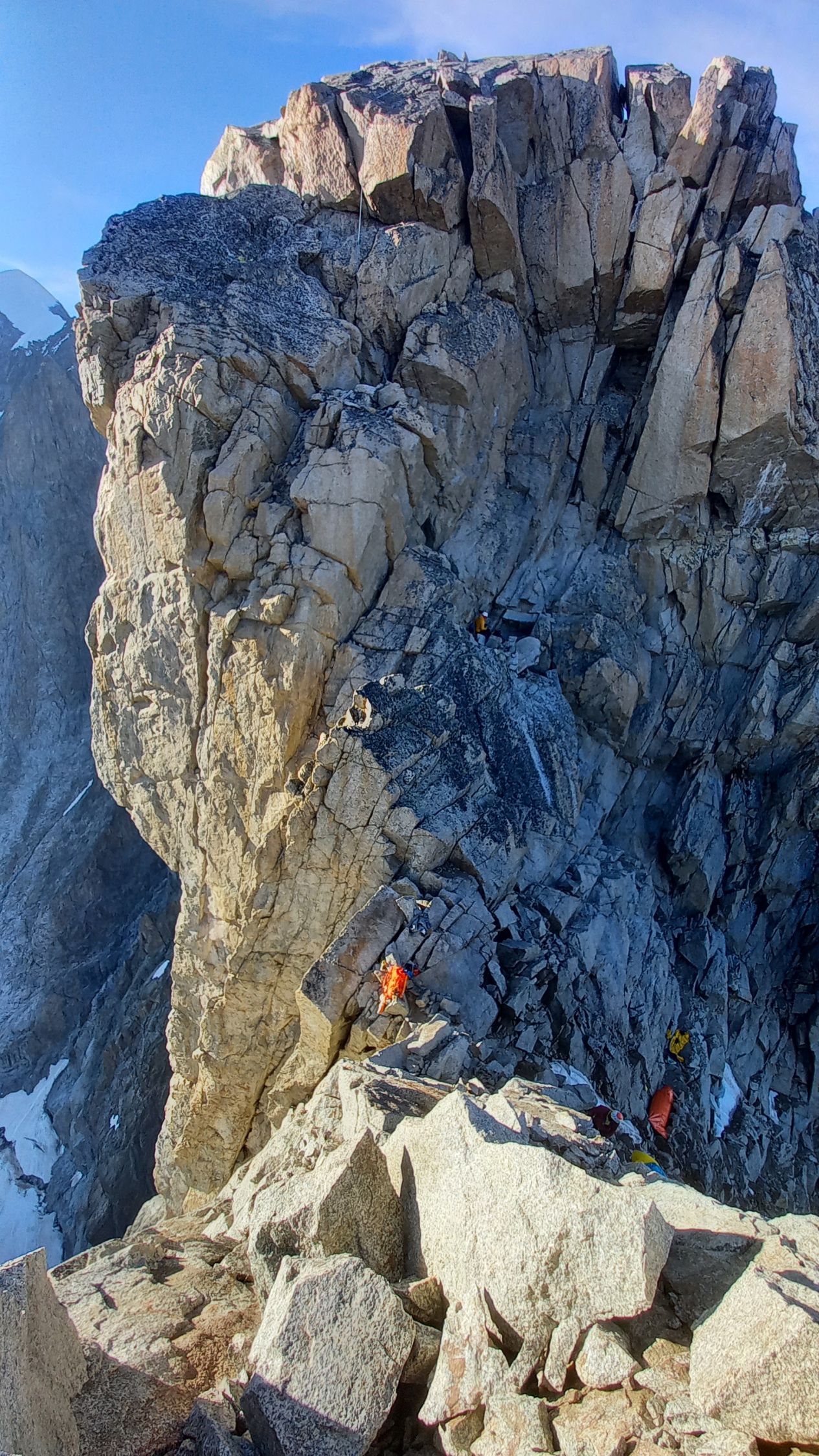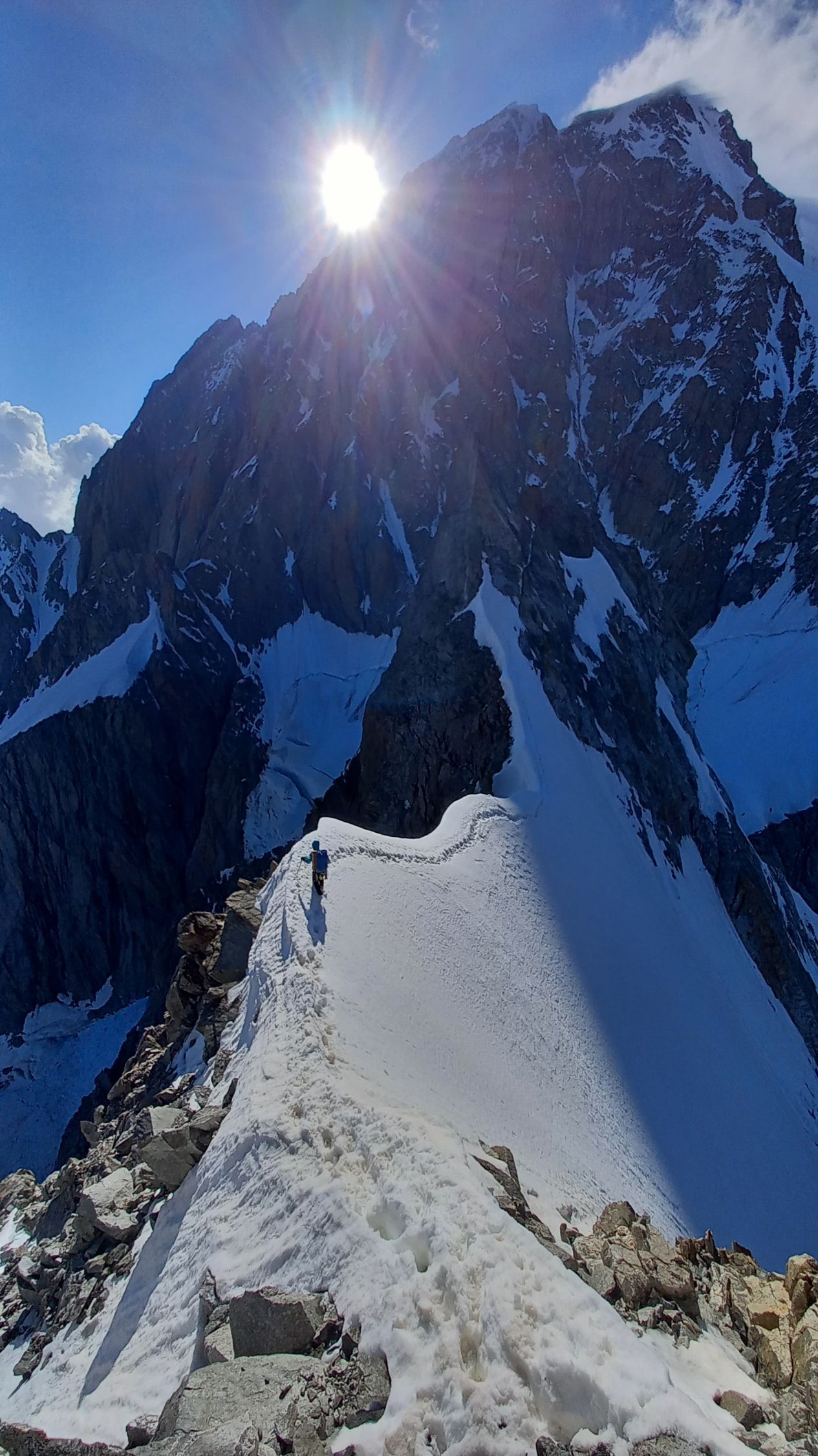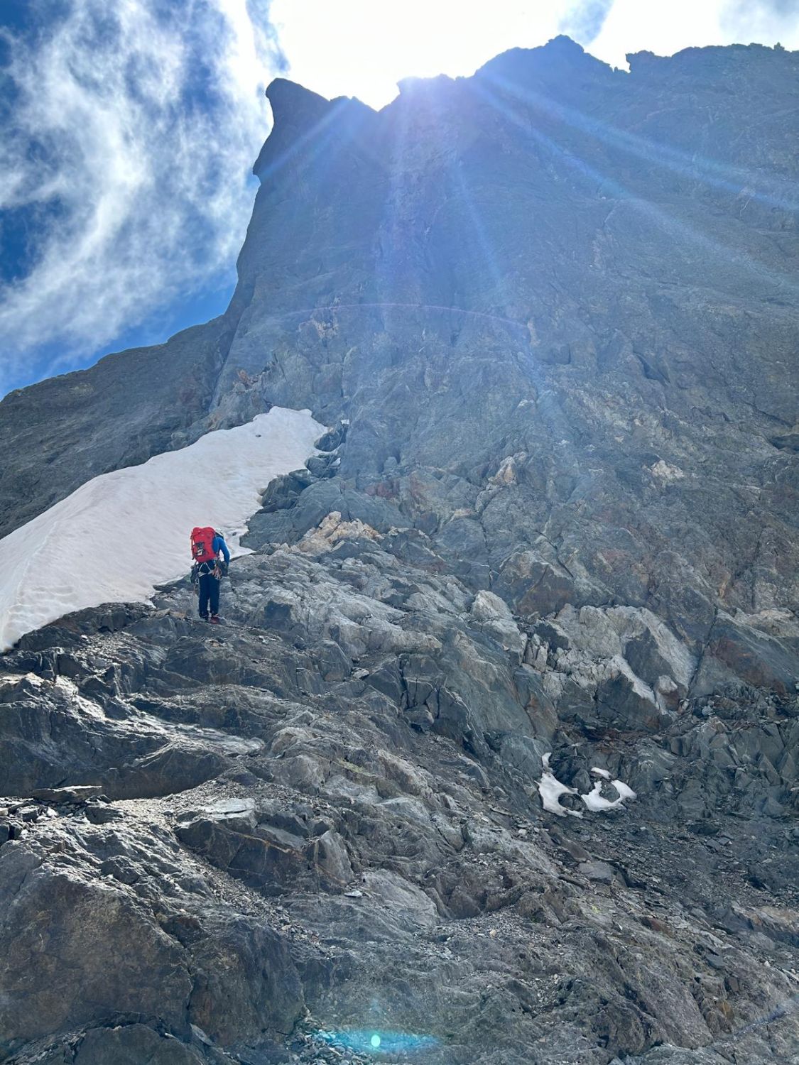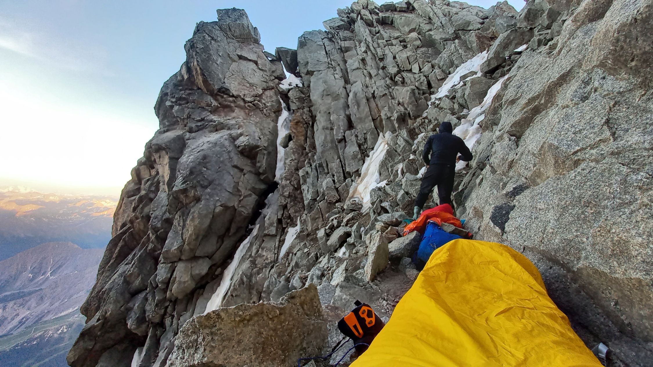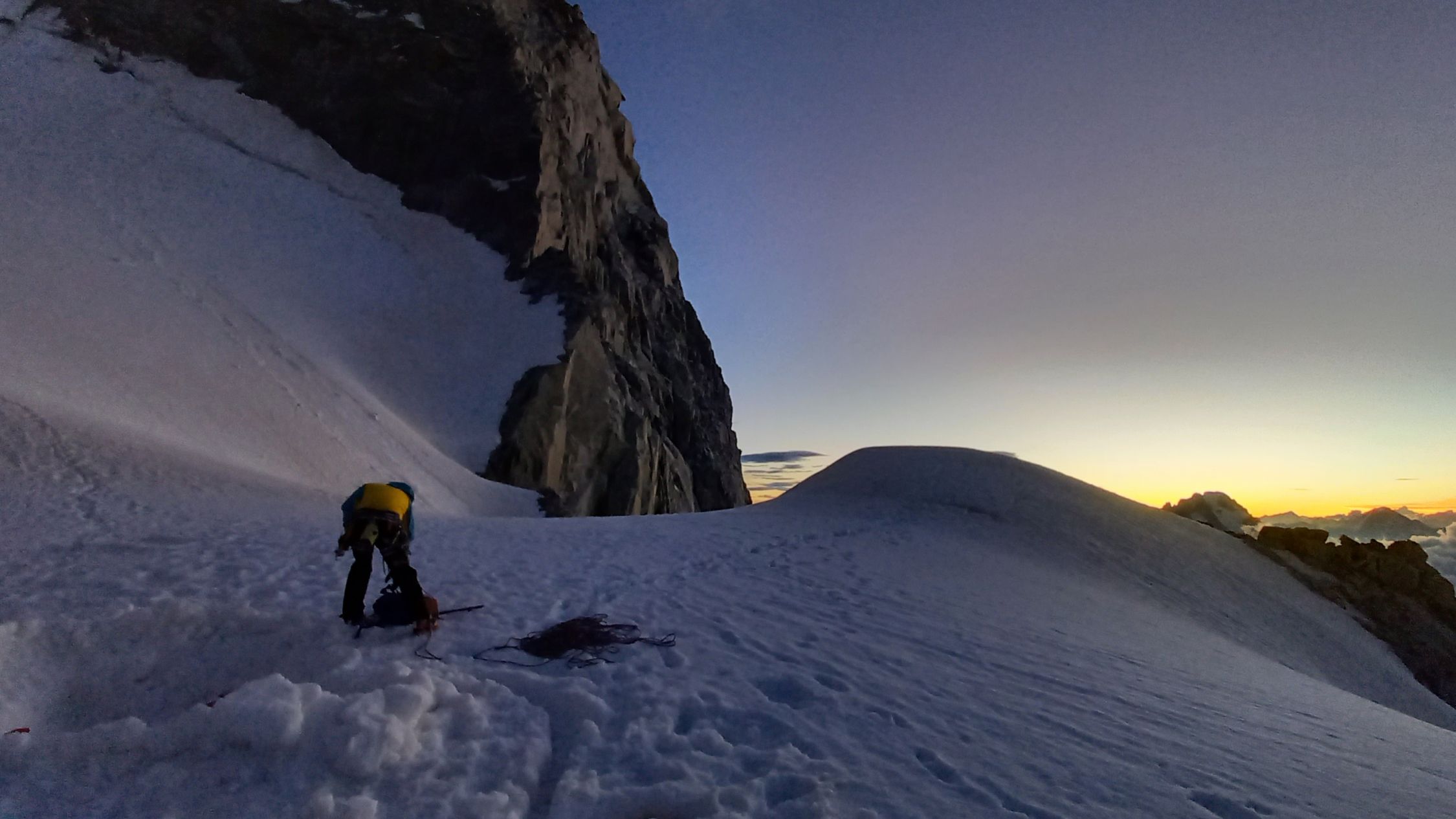 - Nachteil: Am ersten Tag klettern mehrere Seilschaften gleichzeitig los und es kann Stau geben, Col de Peuterey verdammt kalt (zum Glück waren wir erst um 21 Uhr dort und haben dann noch 1h einen Windschutz gegraben während andere schon seit 17 Uhr gefroren haben), Gipfelflanke am Vormittag schon recht weich.