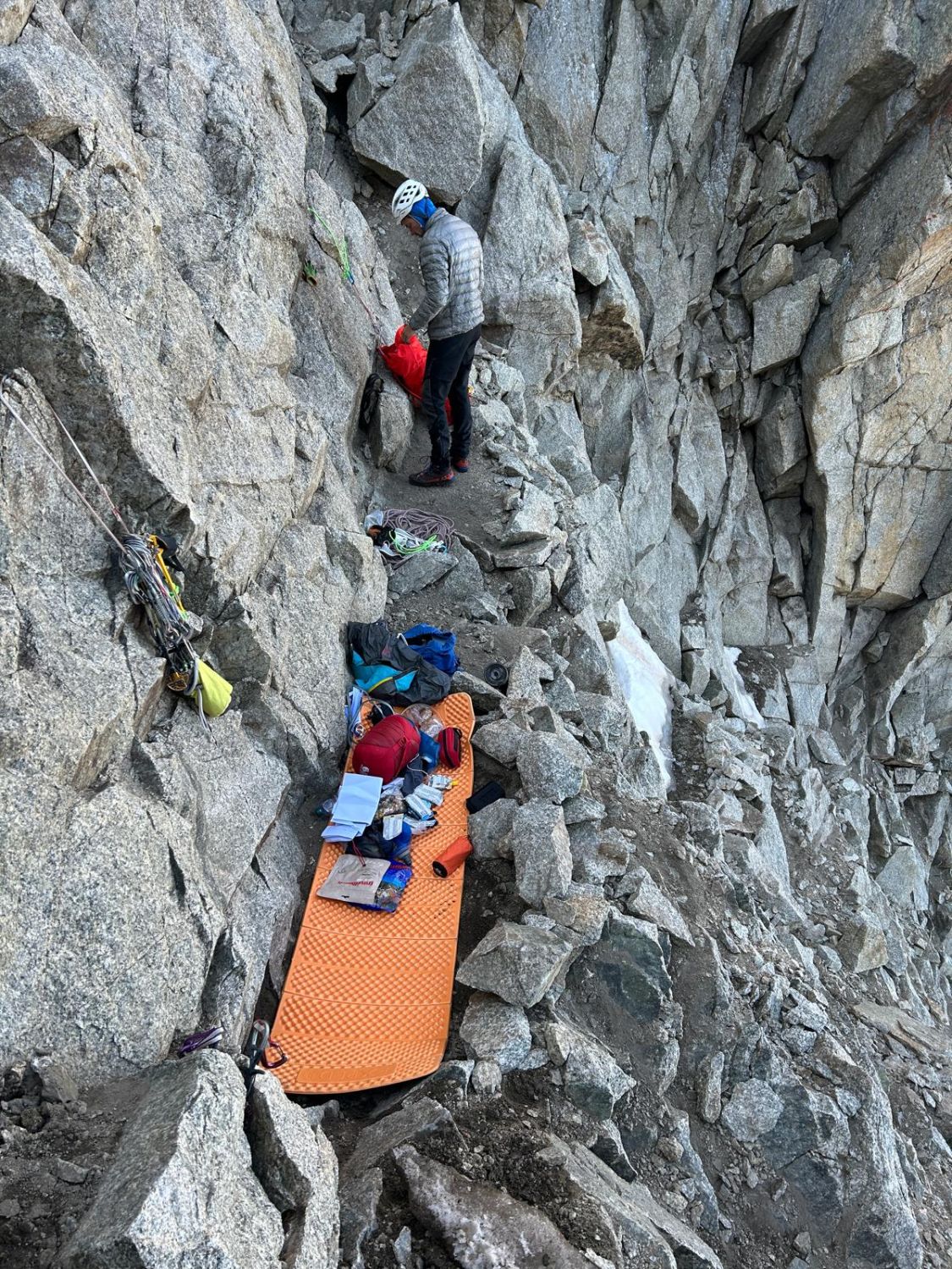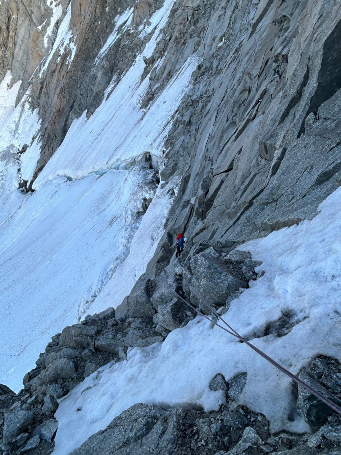 - Vorteil: jew. Bivak mit genug Platz für 2 und Schnee direkt dort, die gesamte Route im Hellen geklettert, 3 gleich lange 12-14h Tage inkl Abstieg, nie unnötig warten müssen, Gondel Richtung les Houches fährt noch. Akklimatisierung sozusagen auf der Tour.
