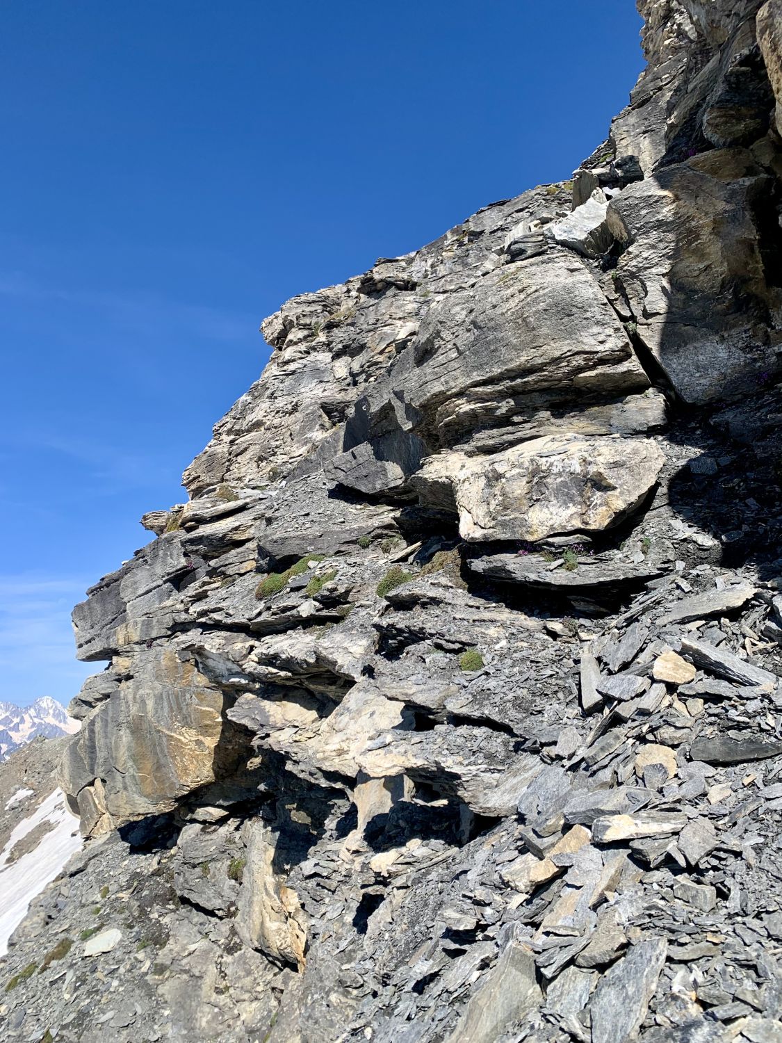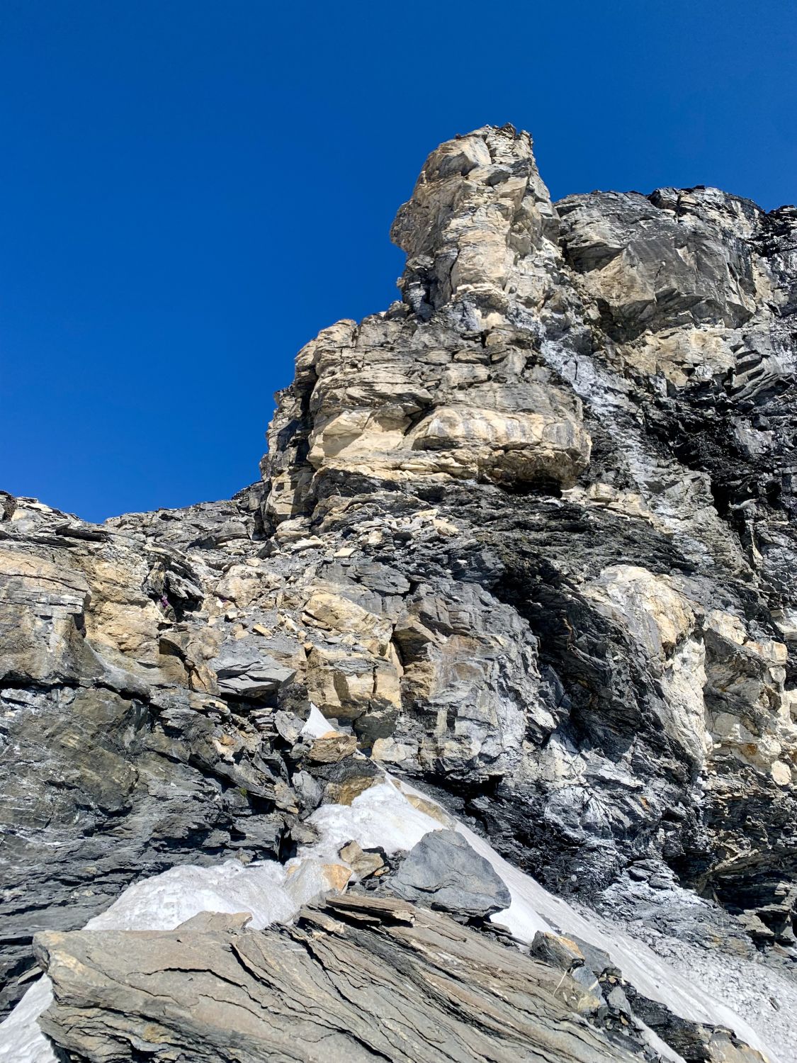 Die Felsbarriere zwischen 3500m und 3550m lässt sich gut machen, aufpassen müsste man nur wegen Steinschlag, falls mehr Seilschaften unterwegs sind.