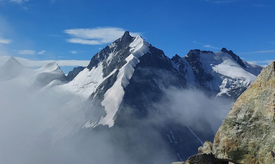 Die Bewertung "gut" ist als Durchschnitt zu sehen. Den Aufstieg zur Fuorcla Prievlusa haben wir, wie wahrscheinlich alle, über den Klettersteig gemacht. Insgesamt bis dahin top. Die Felskletterei auf der gesamten Tour war schneefrei und trocken. Die Heifischlosse haben wir umgangen. An einer Stelle wurde es eisig, hier hat sich aber problemlos eine neue Spur etwas weiter außenrum anlegen lassen. Der Firngrat war großteils recht weich, was aber kein Problem dargestellt hat. Relativ bald nach der Flosse kommt eine Blankeispassage, ca. 40-50m lang (siehe Foto, am Tag vorher vom Piz Morteratsch aufgenommen). Manche Bergsteiger sind hier ungesichert gegangen, die meisten Seilschaften haben aber mit Eisschrauben gesichert was gut möglich war. Das kostet aber natürlich Zeit.