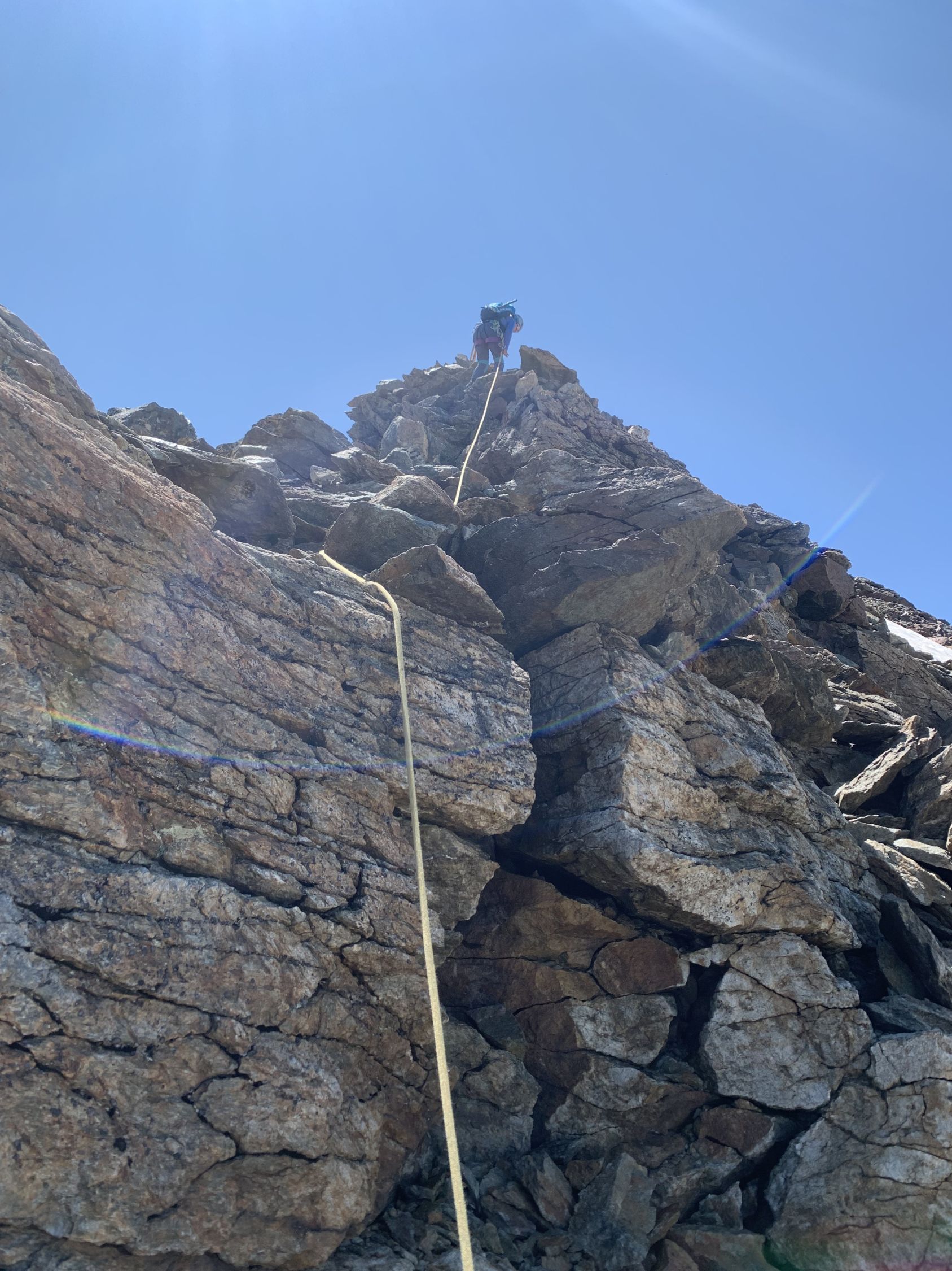 Unten langer Zustieg zum P.2924 durch Grasgelände und Schotter. Danach beginnt es schon bald steiler und Klettern ist angesagt. Es gibt viele lose Blöcke, aber auch viele Sicherungsmöglichkeiten mit mittleren Friends. Meist Klettern im l. Ab und zu auch ll-lll. Abseilen über die Ostflanke mit 30m