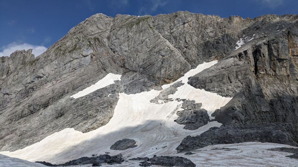 Noch relativ viel Firn beim kleinen Gletscher, Steigeisen und Pickel sicher angebracht. Leider hatten wir diese nicht dabei, so waren wir gezwungen statt schräg das Firnfeld hoch, direkt über den Felsen zu klettern. Abgesehen vom brüchigen Felsen relativ gut machbar, war bei unserer Tour sicher die Schlüsselstelle. Oben sehr schöne Gratwanderung zum Gipfel