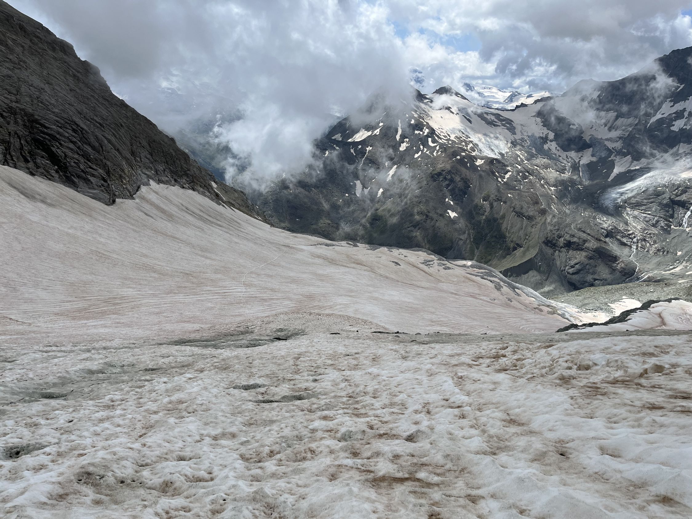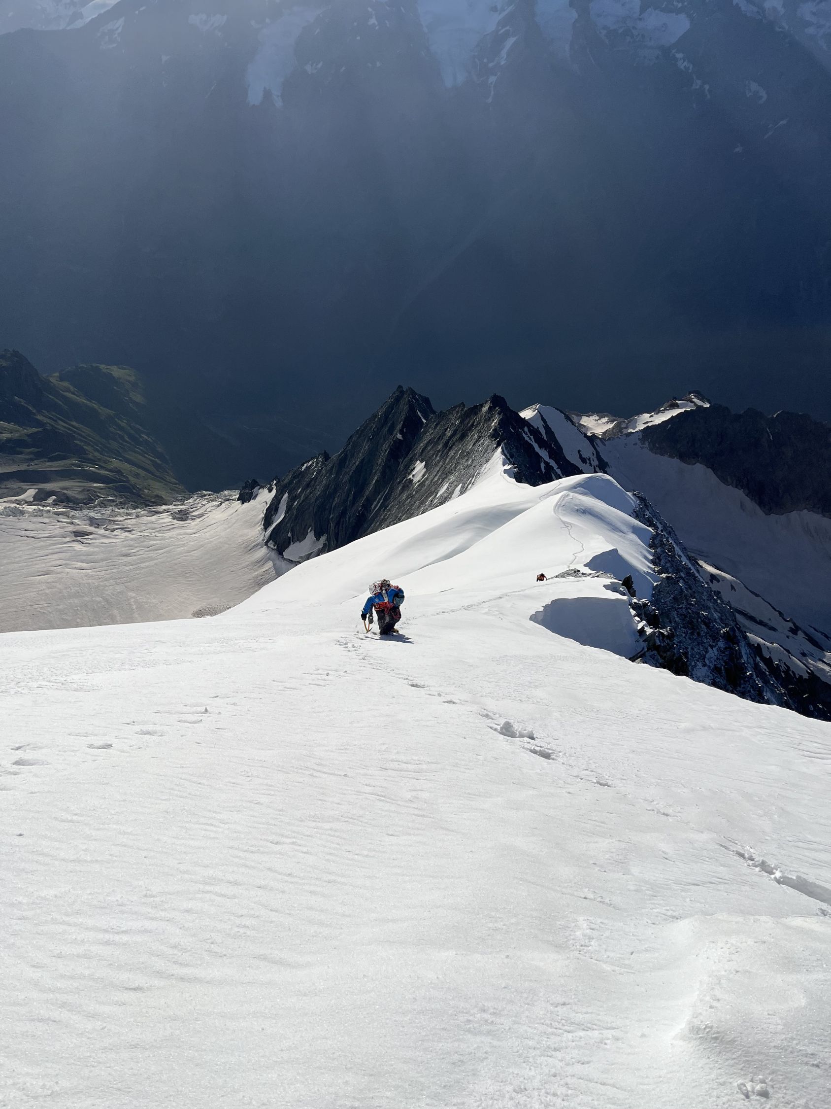 Speziell ist auch der steile Firnabschnitt im Gipfelbereich: beim Aufstieg fest und griffig, beim Abstieg aufgeweicht und teils mühsam zu gehen. Es liegt daran, dass auf der vereisten Firnauflage eine dicke Schicht Neuschnee liegt.