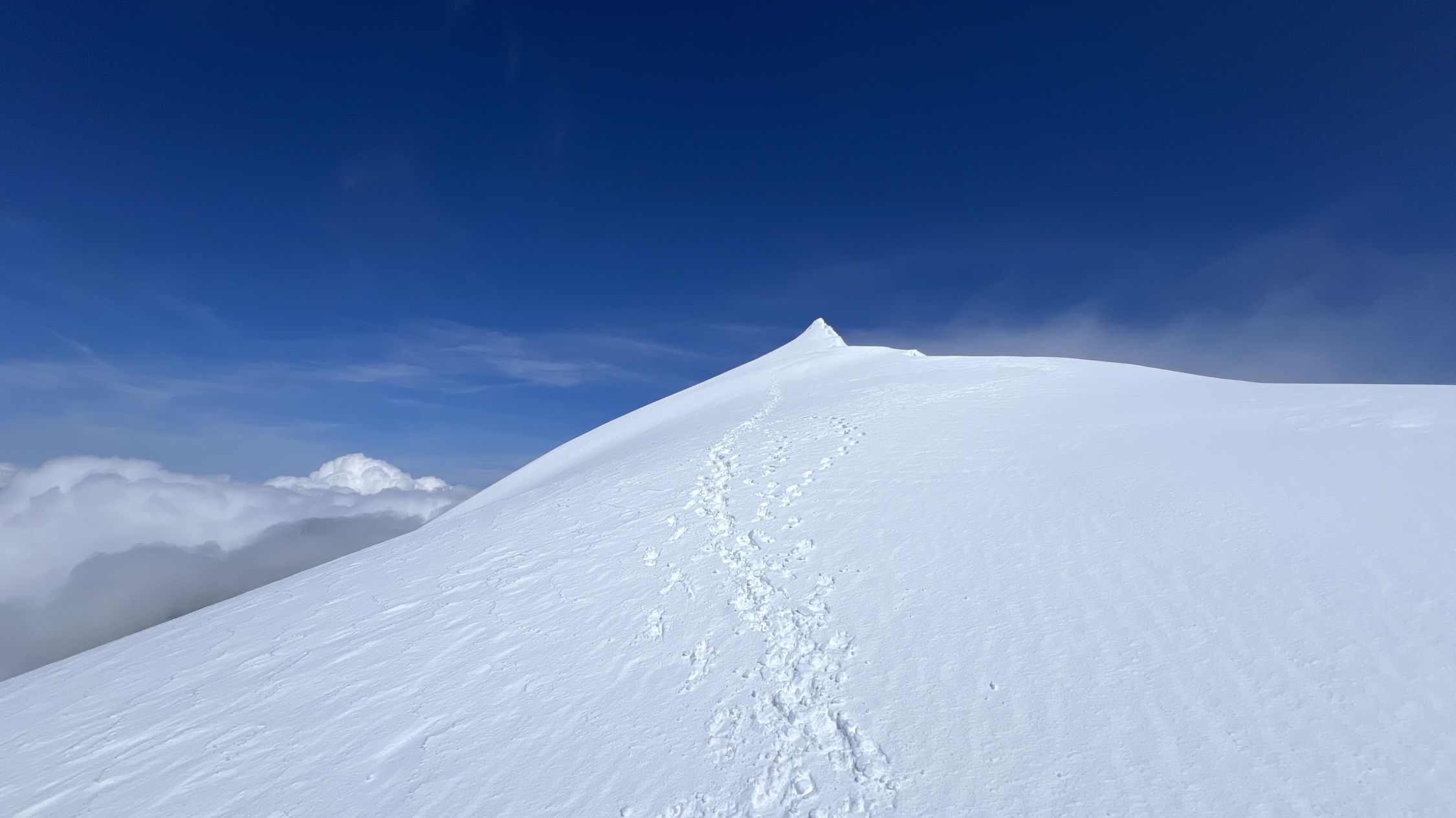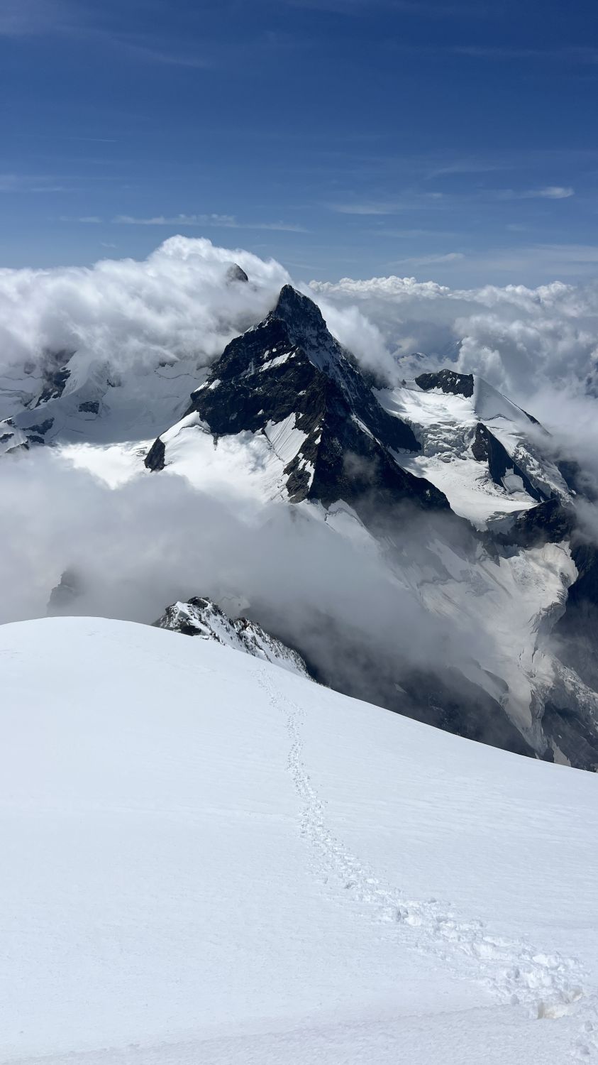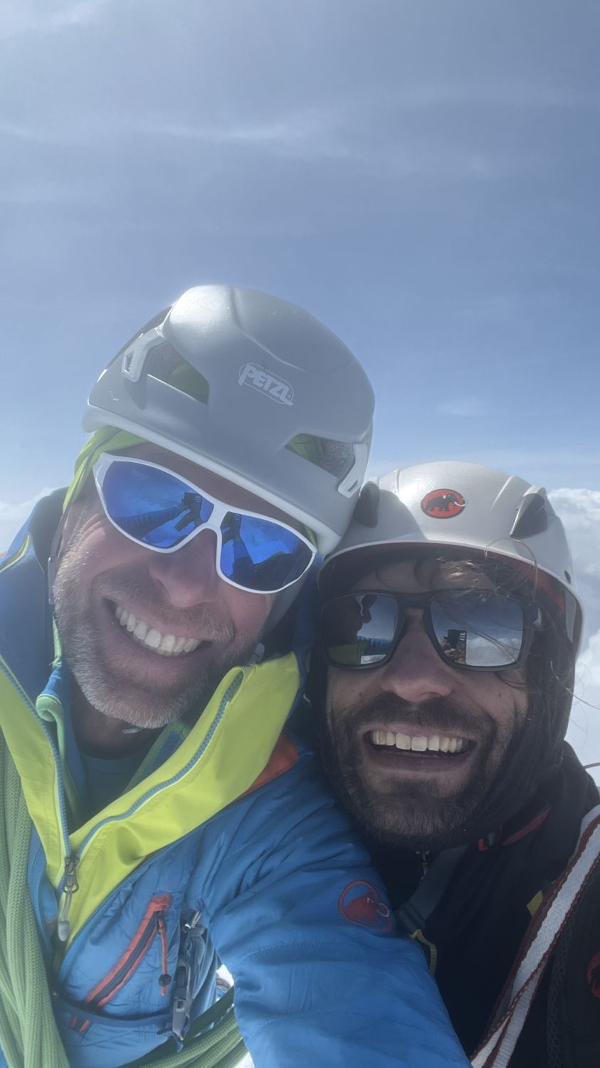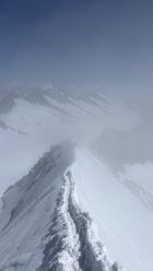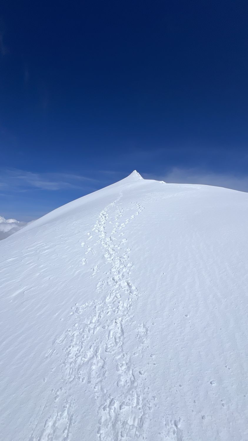 Anspruchsvolle Verhältnisse (Neuschnee von der Nacht zuvor, Nebel, Wind) auf dem SW Grat, ausgezeichnete (eher weiche) Verhältnisse auf der Normalroute beim Abstieg