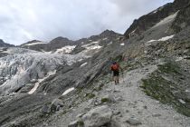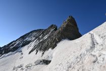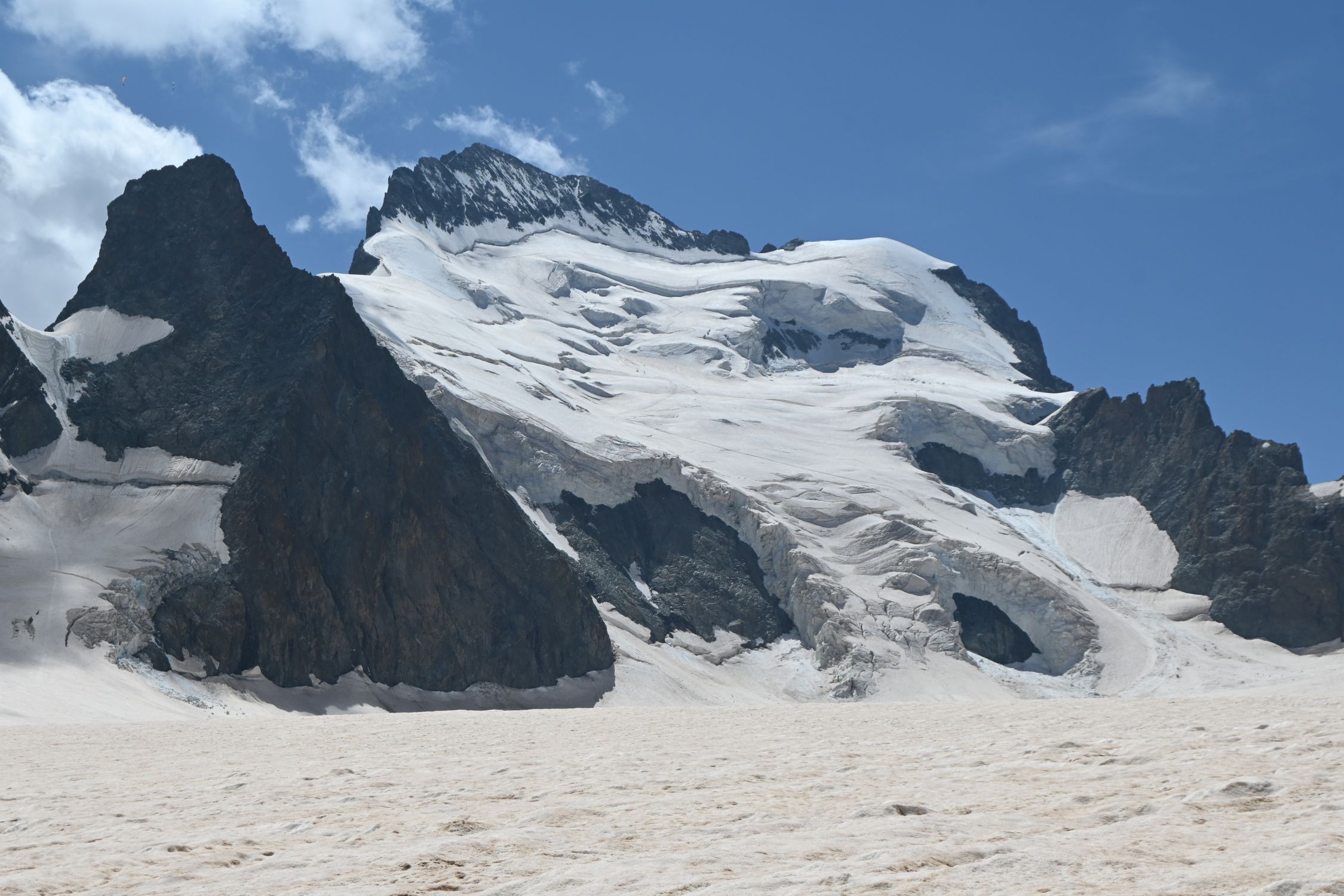 In der Nordflanke quert man die Ausläufer des unteren (rechten) Serac noch im flachen und steigt dann daneben steil an. Die grossen Spalten in Mittelteil können im Moment noch ohne grosse Umwege gequert werden, allerdings ist mindestens eine der Spaltenbrücken schon recht fragil. Im oberen Drittel ist eine Querspalte, die man ca. 3-4m fast senkrecht hochsteigt. Oben gibt es eine Reepschnur zum Nachsichern. Die Umgehung (von unten gesehen) links ist nicht zu empfehlen und nur mit einer steilen Querung unter Seracs möglich. Den Bergschrund übersteigt man etwas rechts unter dem Dome de Neige.