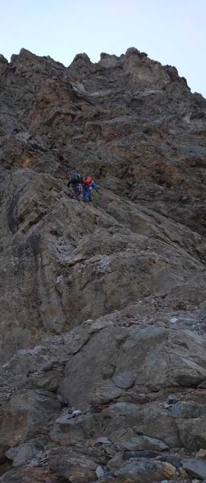 Bis zum Pt. 3789 alles trocken und schneefrei. Hochfirn war sehr angenehm zu gehen, kein Blankeis. Im Abstieg war der Firn um 09:00 schon ziemlich aufgeweicht. Im Rottalsattel beim Bergschrung ist eine Leiter montiert. Wir gingen die direkte NO-Variante runter zum Joch.