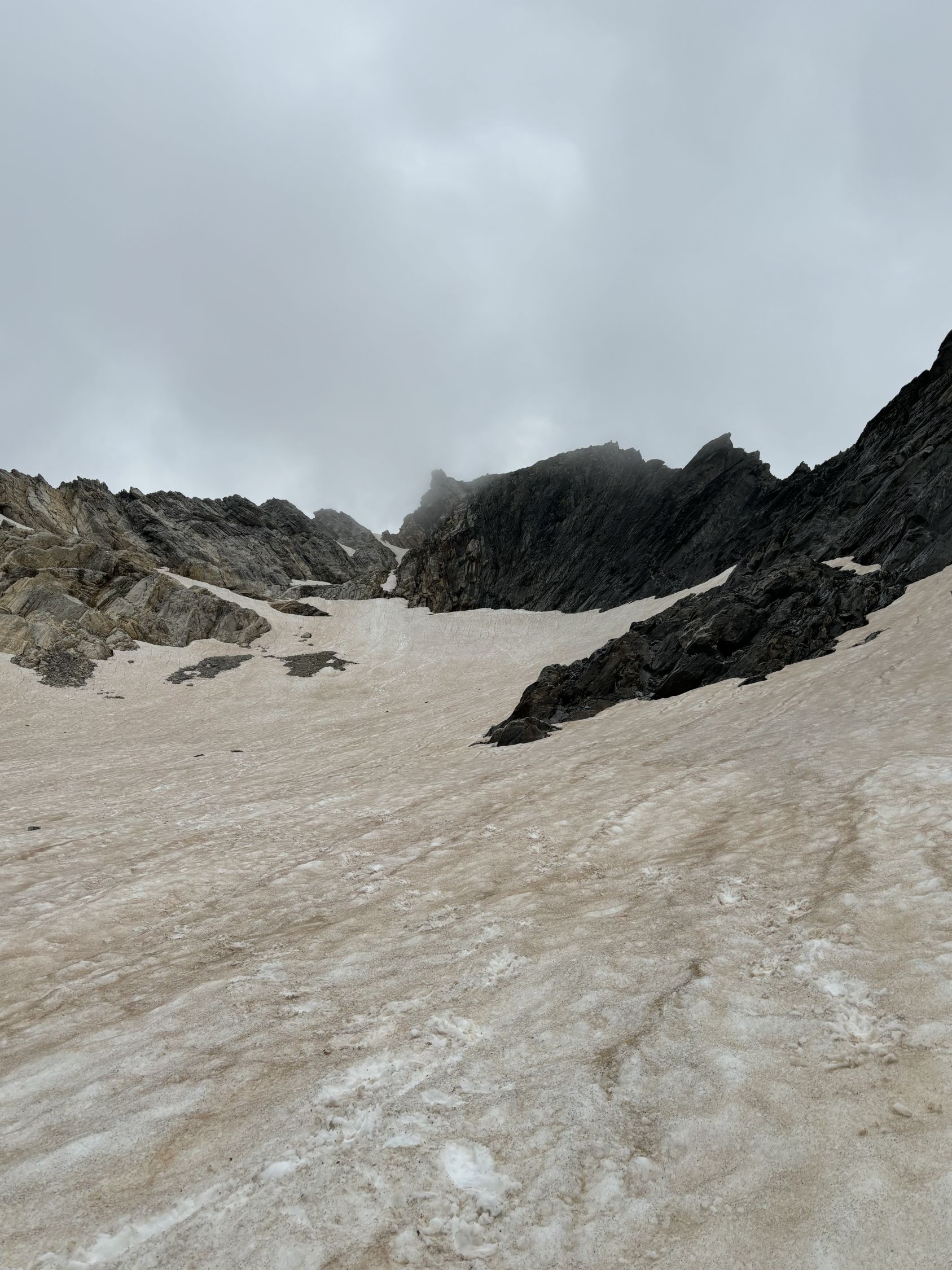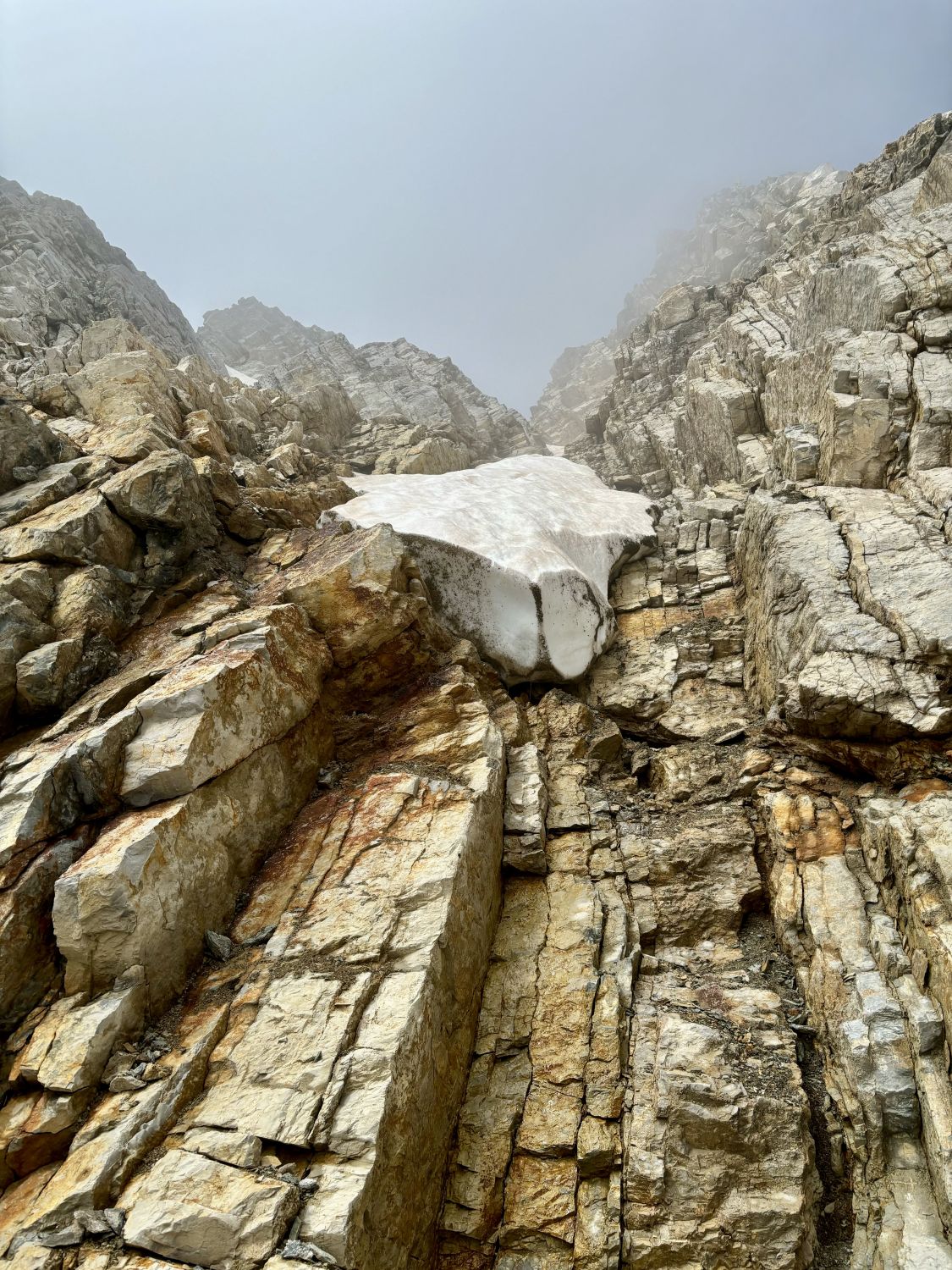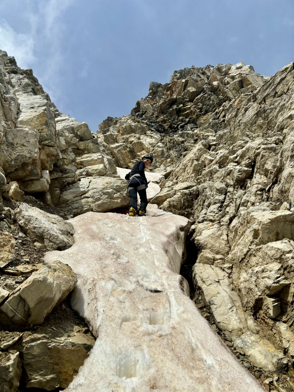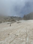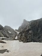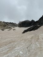 Bis zum Couloir ausgezeichnet. Direkter Einstieg dann allerdings nicht mehr möglich, siehe Bild. Umgehung südlich durch Fels und Schutt bis ins Couloir noch machbar. Im Couloir nimmt die Schneedecke schnell ab - bald muss im Schutt aufgestiegen werden oder am Fels (was unangenehmer als eine II sein dürfte, da abwärtsgeschichtete Platten mit viel losem Material).