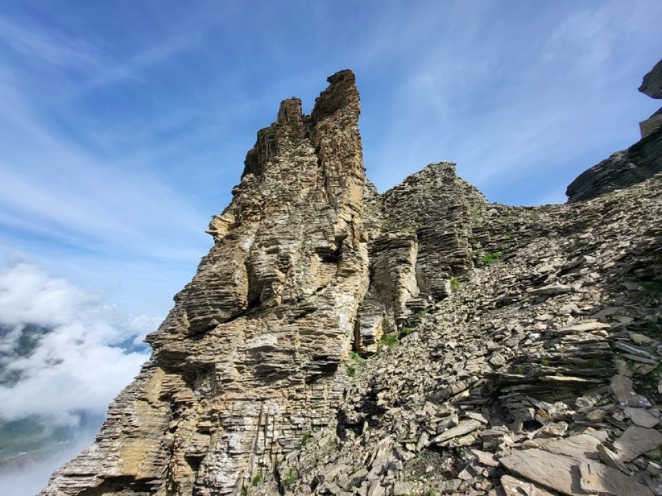 Die Crux der Tour ist aus unserer Sicht der Zustieg (steile Schuttflanke nach dem Bergweg, welche mehr oder weniger direkt zum Einstieg führt) zur eigentlichen Kletterei. Die "deutlichen Wegspuren", welche im SAC Führer erwähnt werden, haben wir nicht gefunden. Helm auf und durch! T5-Gelände. Achtung: Die losen Steine rollen direkt Richtung Bergweg!