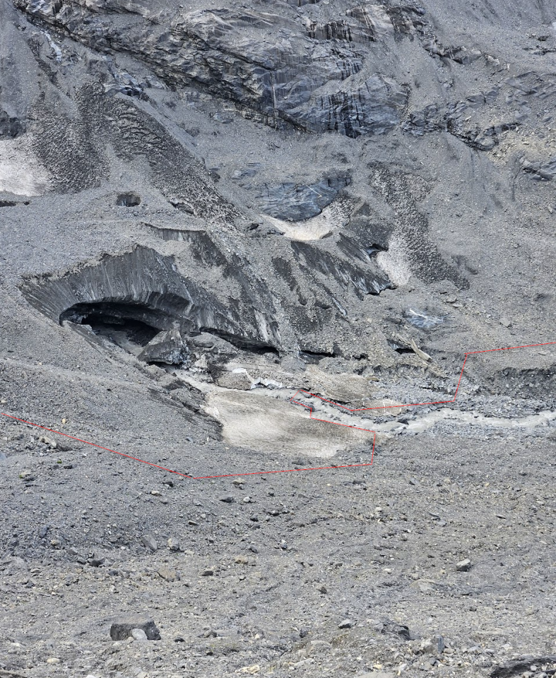 Die Querung des Schwarzbach auf ca. 2'200m ist nicht möglich. Stattdessen den Steinmännli bis zum Beginn des Gletschers folgen. Wir entschieden uns, den Schwarzbach hier zu queren und zur Moräne aufzusteigen. Dies geht am besten einen Einschnitt weiter hinten, als dort wo der Schwarzbach auf der Karte eingezeichnet ist. Am Ende der Moräne gut nach Steinmännli Ausschau halten und wenige Höhenmeter auf den toten Gletscher absteigen. Zum Schluss nochmals rechterhand einige Meter absteigen, wenn man zur nicht mehr begehbaren Eisbrücke kommt. Hier hat es unten eine Senke, um welche sich ringförmig einige grosse Spalten ziehen. Diese können Nord-Östlich umgangen werden.