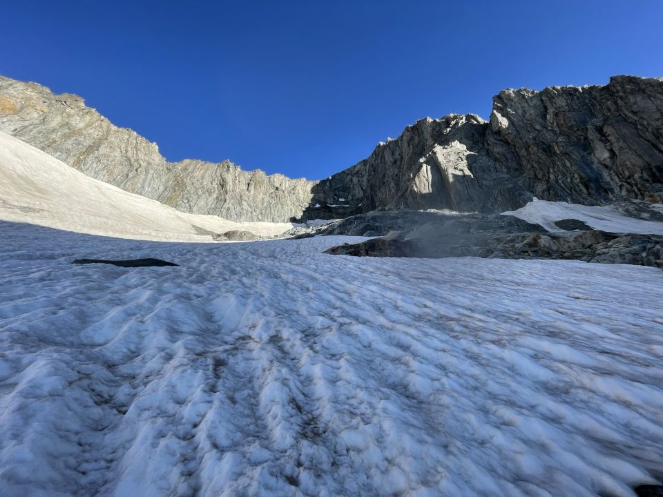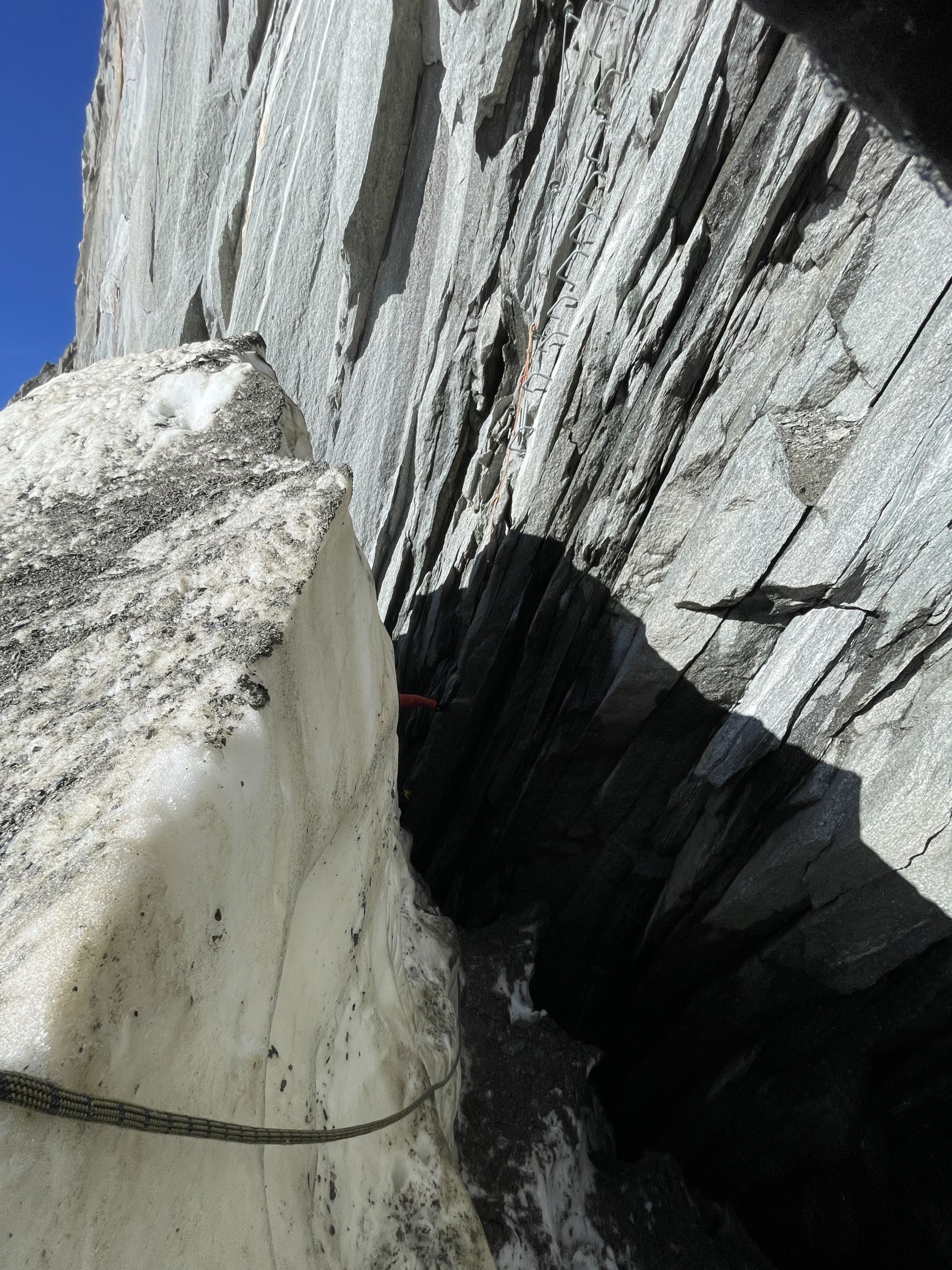Der Gletscherschrund ist enorm. Der Abstand zwischen Fels und Eis beträgt rund 2m. Aber es kann (noch) in den Schlund herabgestiegen werden um einfach an die Wand zu kommen. Allerdings steht man dann rund 4 Meter unter dem ersten Tritt, der somit erklettert werden muss. Schwierigkeit schätzungsweise 3-4 Grad und nasser Fels. Da hat uns der Mut verlassen und wir sind umgekehrt.