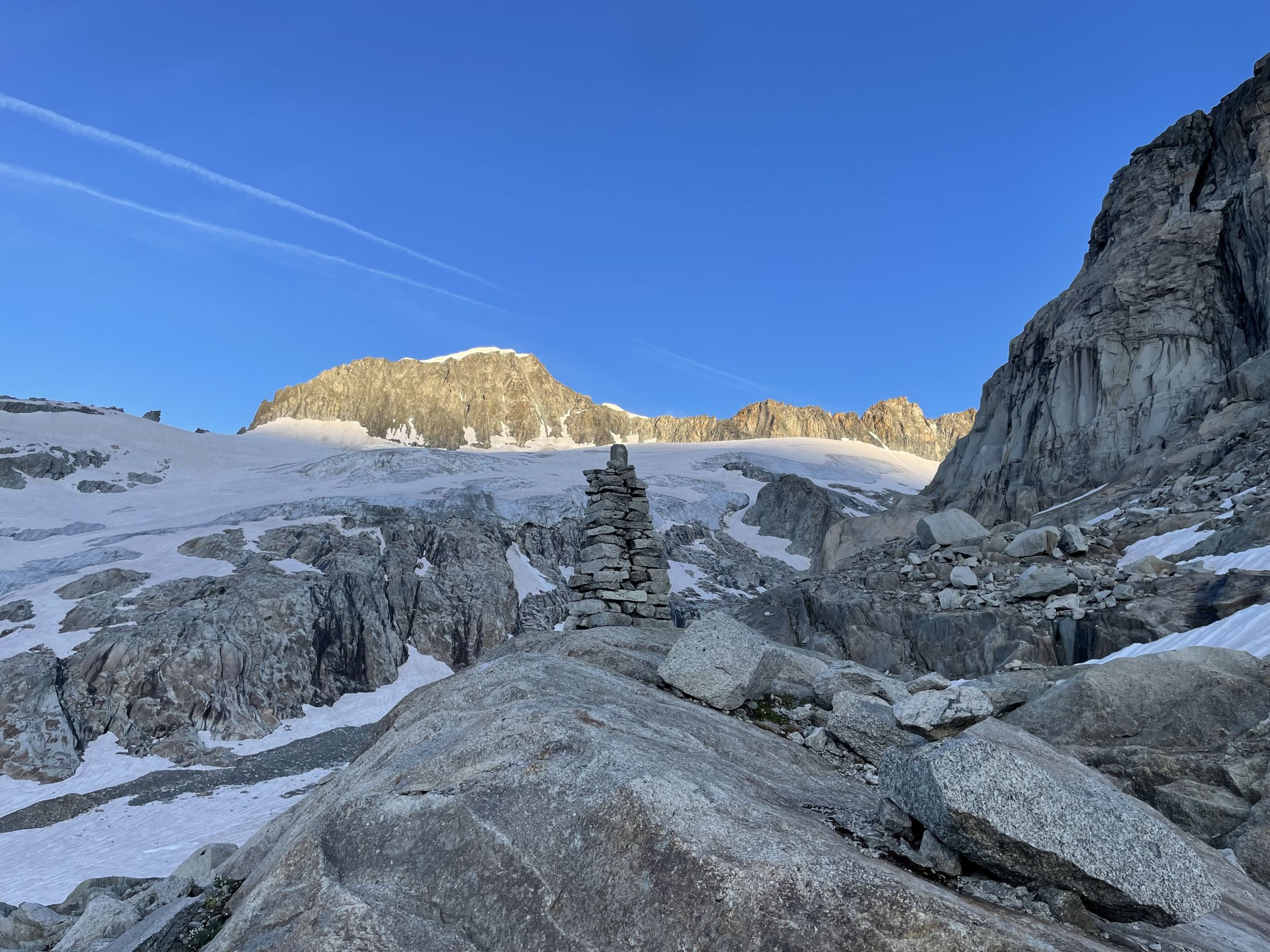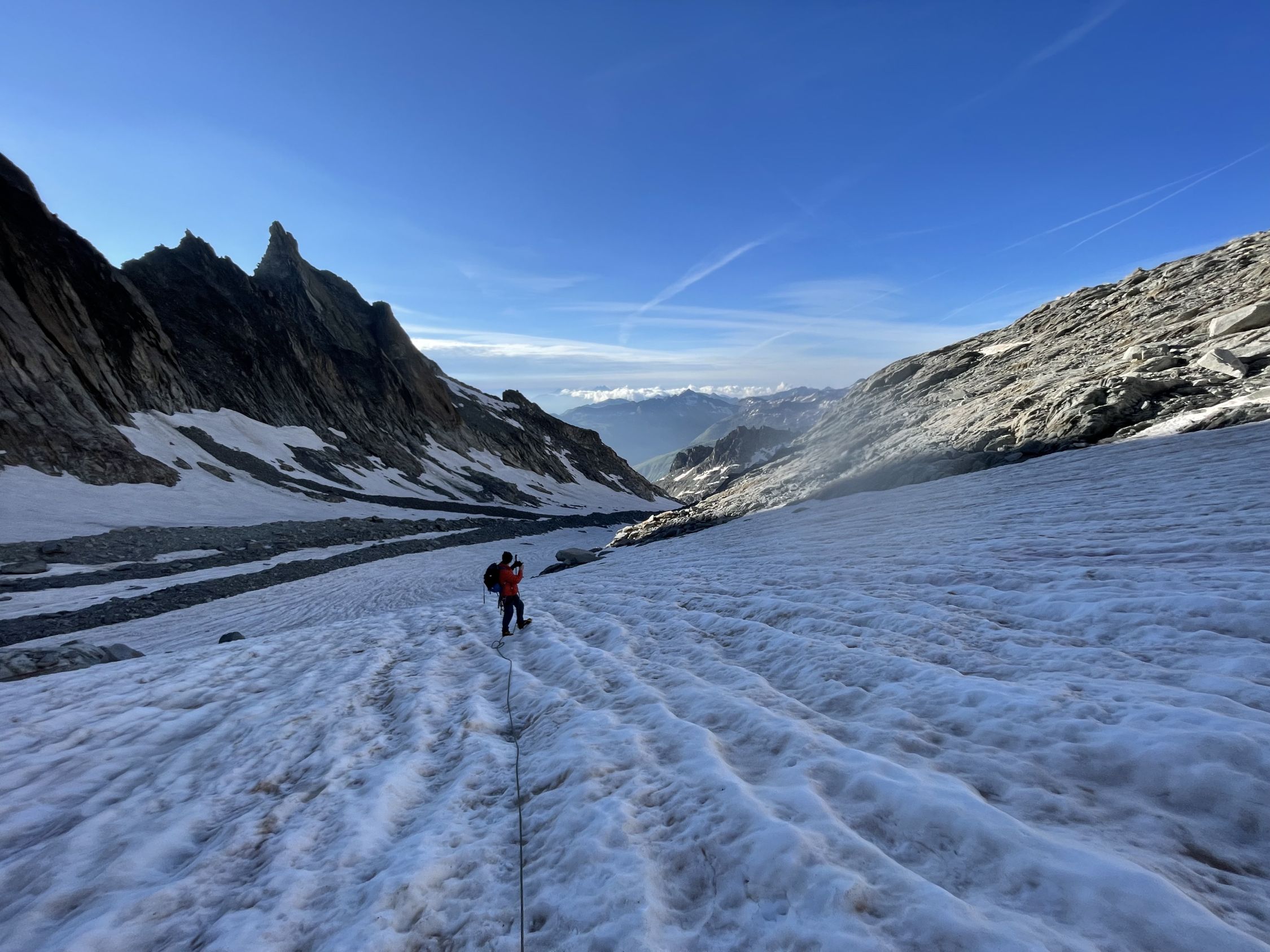 Bis zum Klettersteig Einstieg hervorragende Verhältnisse. Der Schnee auf dem Gletscher trägt sehr gut.