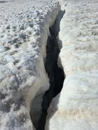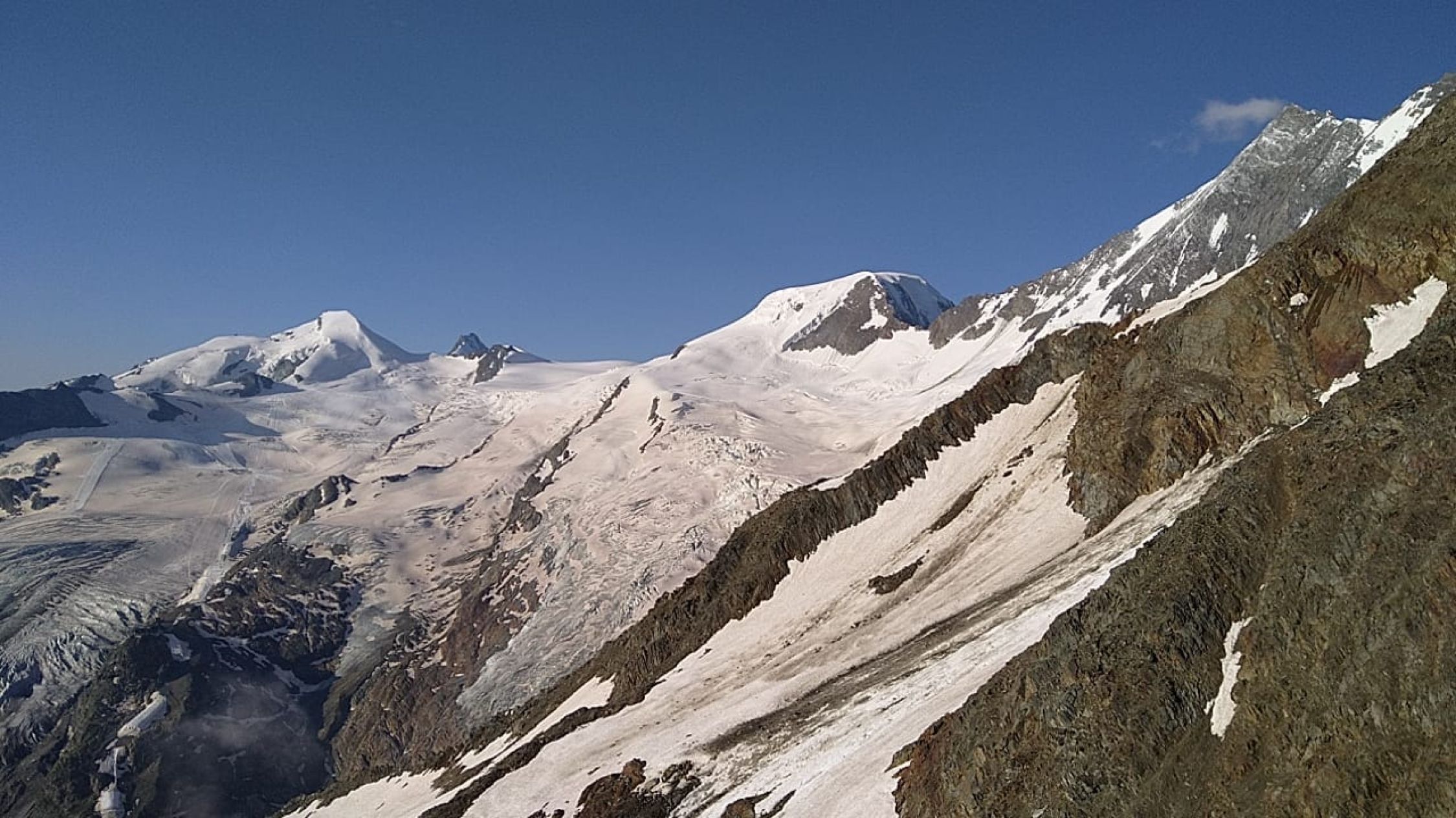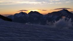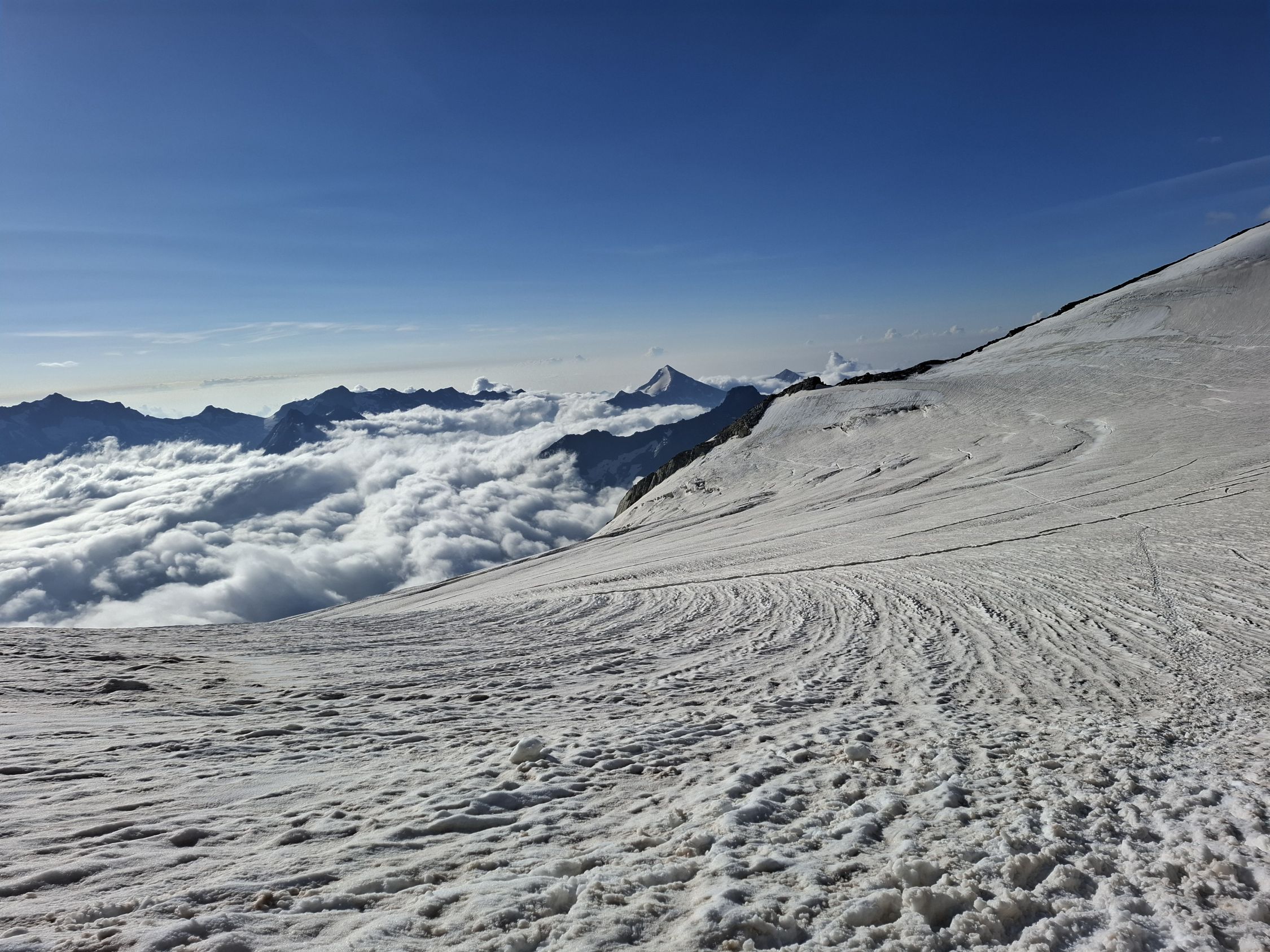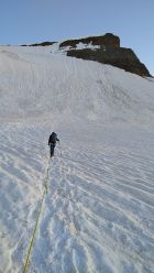 Beste Verhältnisse auf der gesamten Route. Die Spalten werden mehr. Einstieg vom Grat in den Gletscher hoch genug angehen, über 3600m!