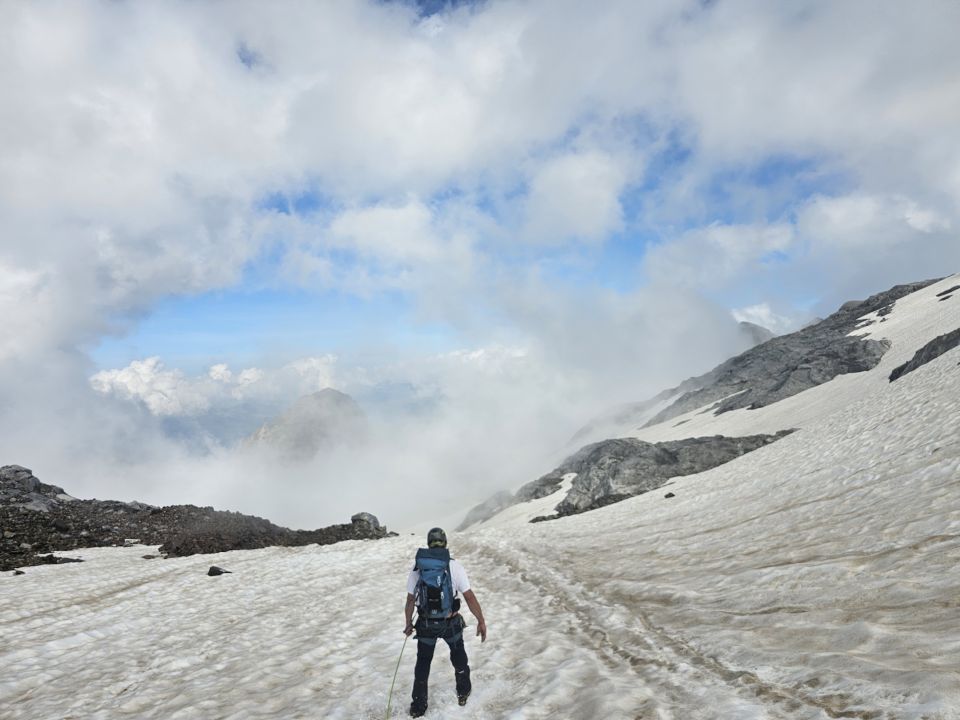 Bis zum Chli Schlieren noch nass vom Nebel. Danach der Felsen trocken, keine Schneereste mehr am Grat vorhanden. Fels teilweise brüchig. Wegfindung Ausgezeichnet mit blauen Markierungen (ca. alle 5 Meter). Abstieg zur Musenalp, bis ca. 2700 noch tragende Schneefelder, die den Abstieg verkürzen.