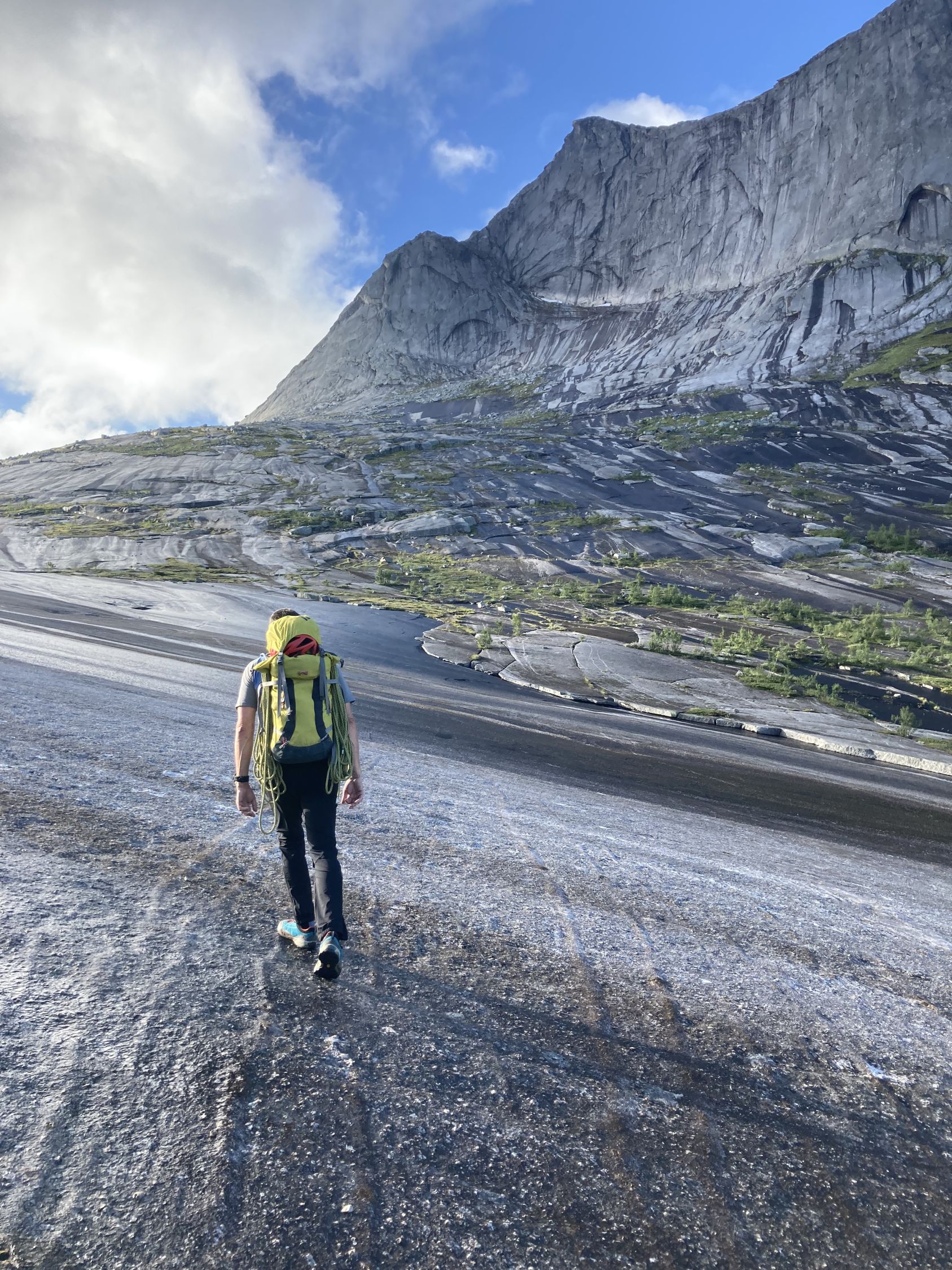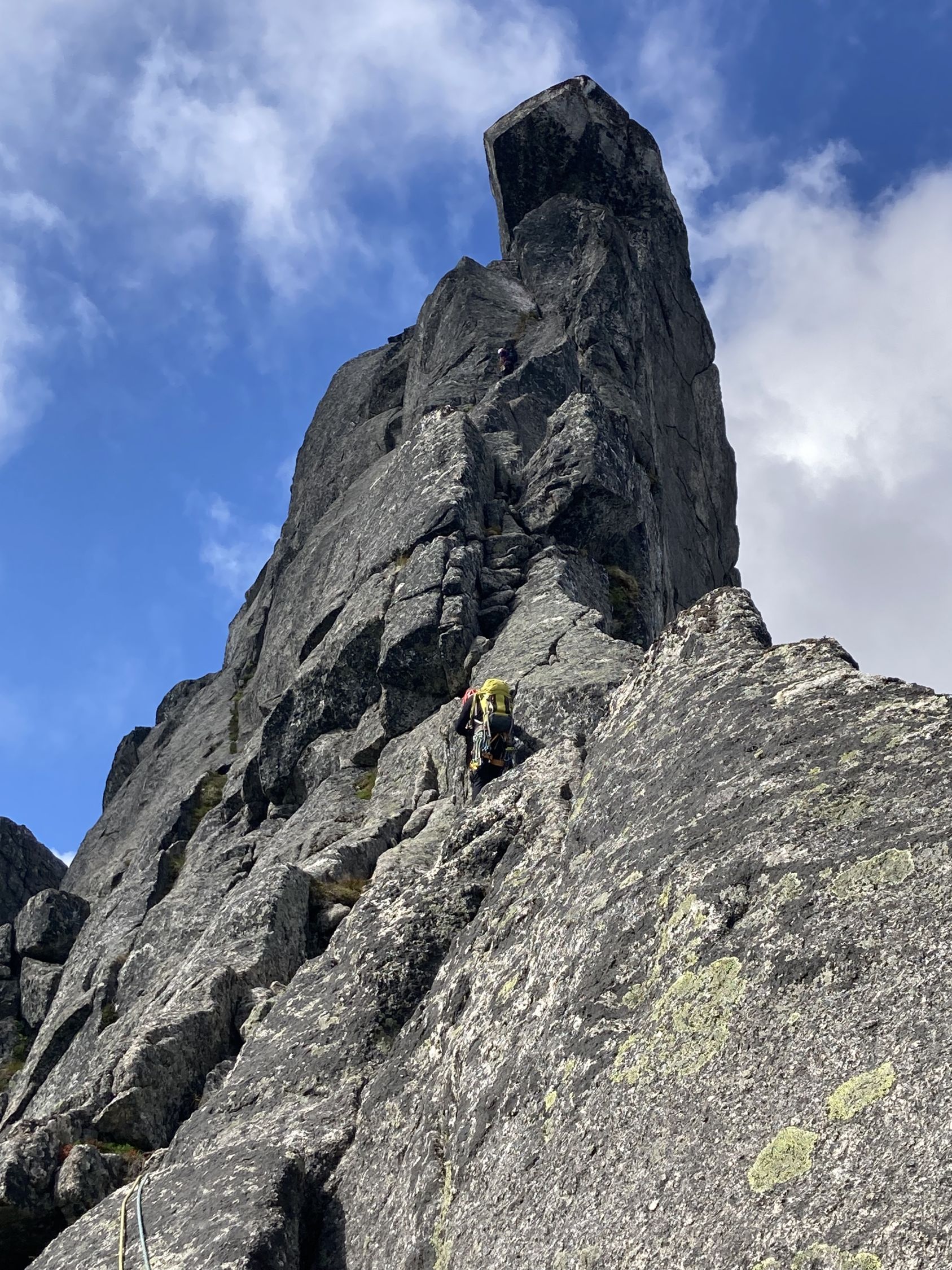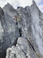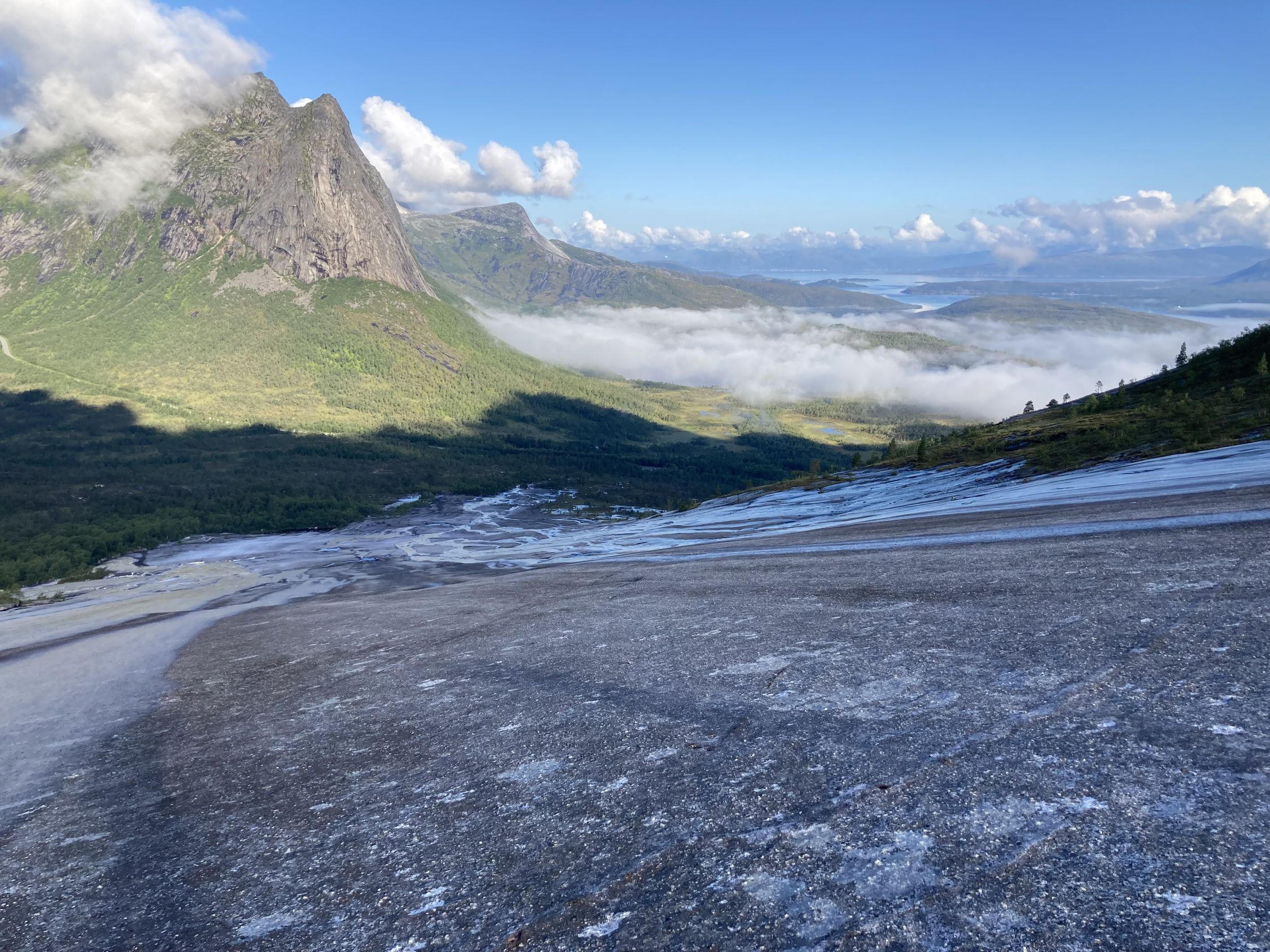 Die Kletter-Route selbst: wunderbare Genusskletterei in luftiger Position, gut absicherbar mit Friends. Die Ausblicke reichen zum nahen Tysfjord / Efjord bis zu hin den Lofoten/ Vesteralen.