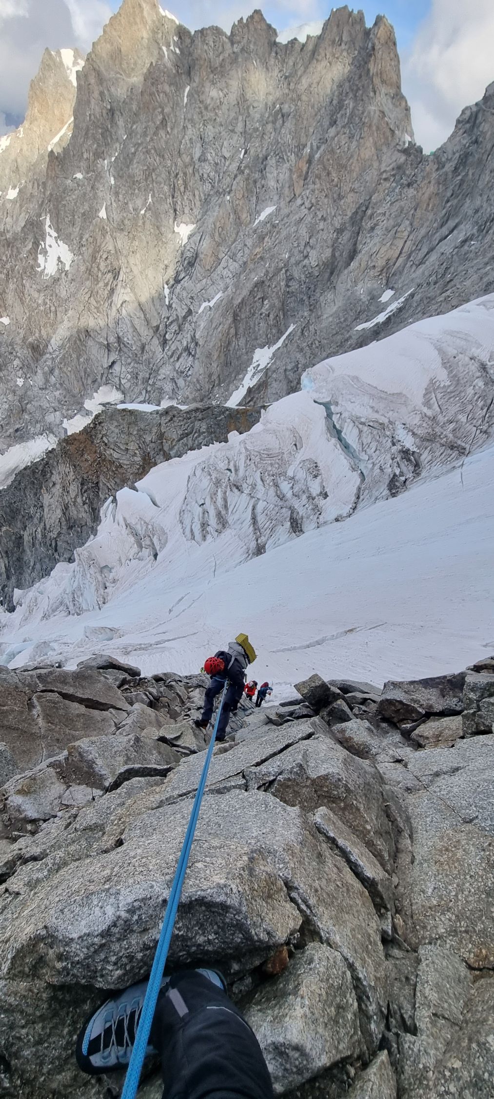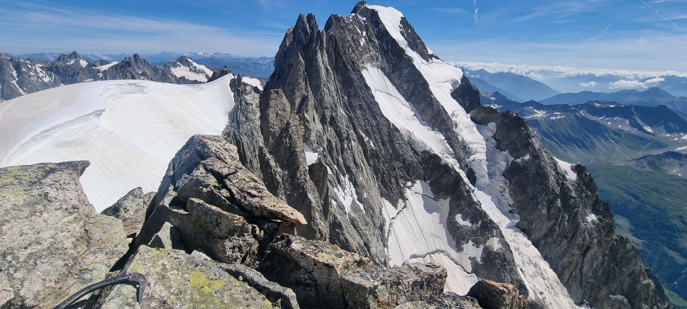 Auf der Jorasses Traverse sind sämtliche Kletterpasagen komplett Eis- und Schneefrei. Bivouac Canzio sauber. Abstieg über den Normalweg wird nicht mehr empfohlen (wurde aber gemacht), Rif. Boccalatte geschlossen. Wir haben uns für die Whymperrippe entschieden und kurz unterm Gipfel biwakiert, um das Stein- und Eisschlagrisiko beim frühen Abstieg zu reduzieren (bei der Querung des Couloirs nach Abseil von der Whymperrippe um 8.00 war alles ruhig). Das Durchkommen auf dem Planpincieux Gletscher bereitet derzeit keine Probleme, ein Eisgerät ist also für die Tour ausreichend.