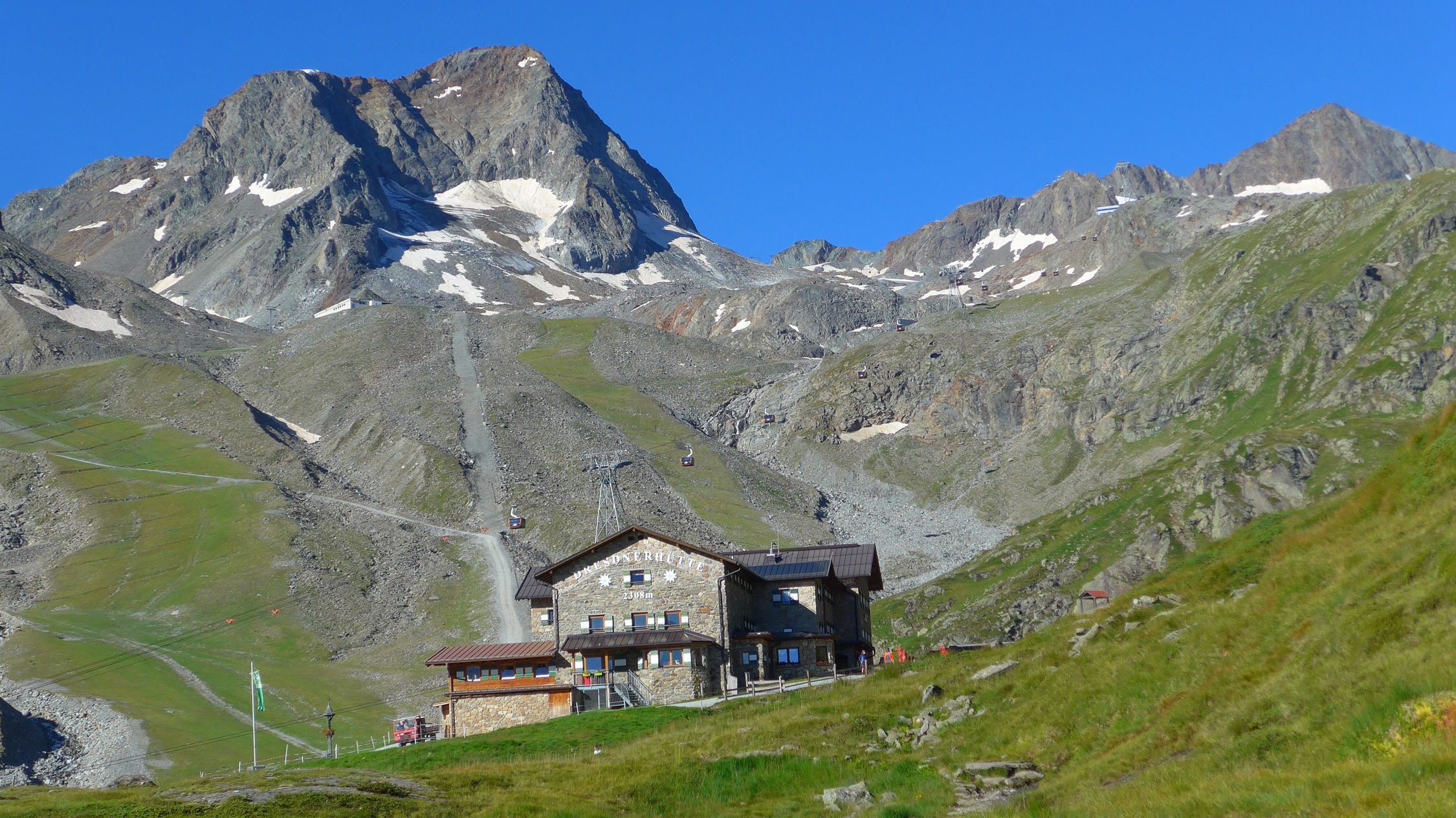 Es folgt nun ein fantastischer Höhenweg mit grandiosen Ausblicken und einem Bergpanorama das seinesgleichen sucht. Die letzten Höhenmeter vor der Dresdner Hütte wandern wir dann auf Tuchfühlung mit den Kieslastern der Stubaier Gletscherbahnen. Dafür wohnt man in der Hütte wie im Hotel. Mit Doppelzimmer, feiner Dusche und einem kulinarischen Buffet das keine Wünsche offen lässt (T4, 8h, 1000/950 Hm auf/ab).