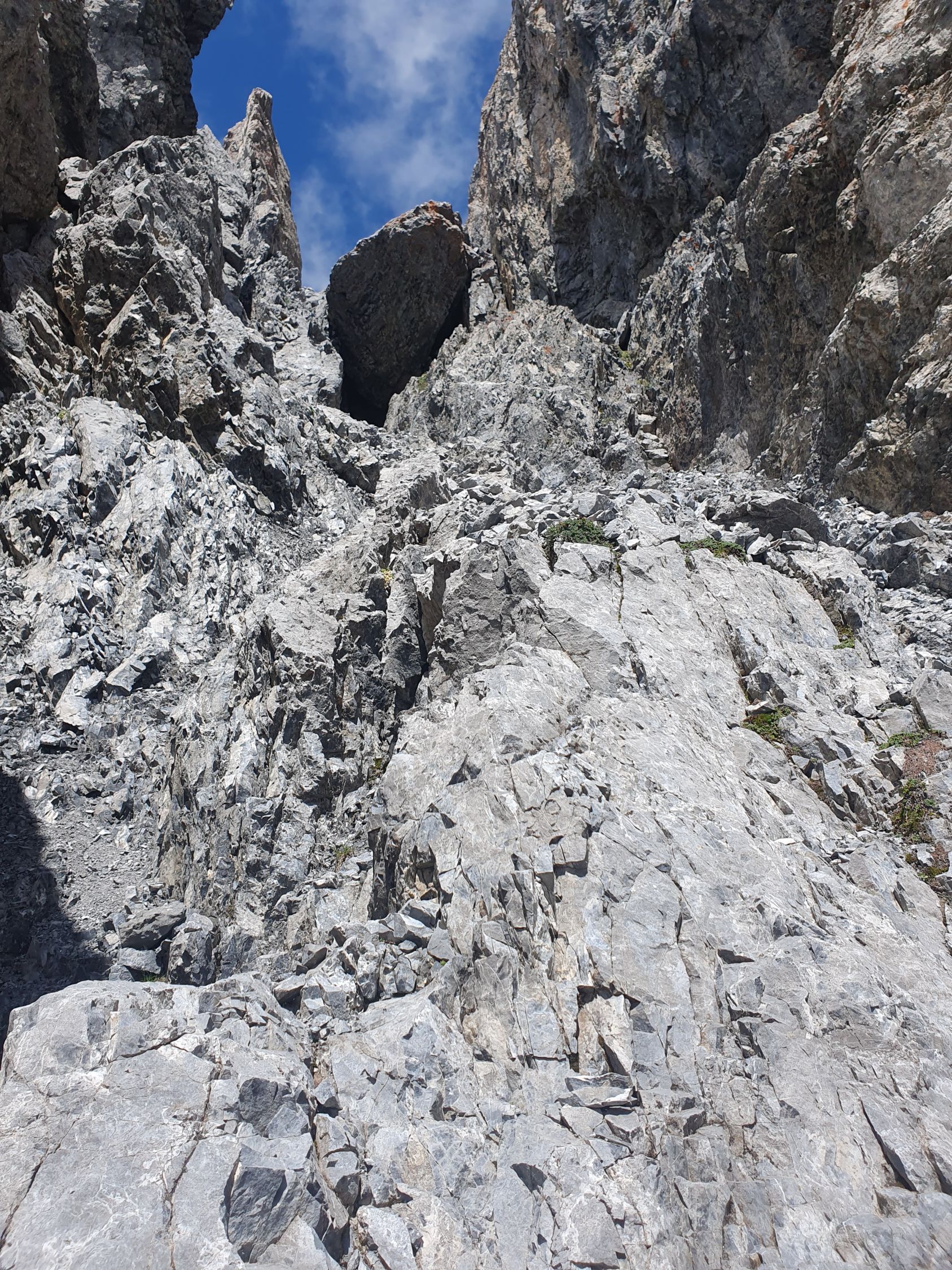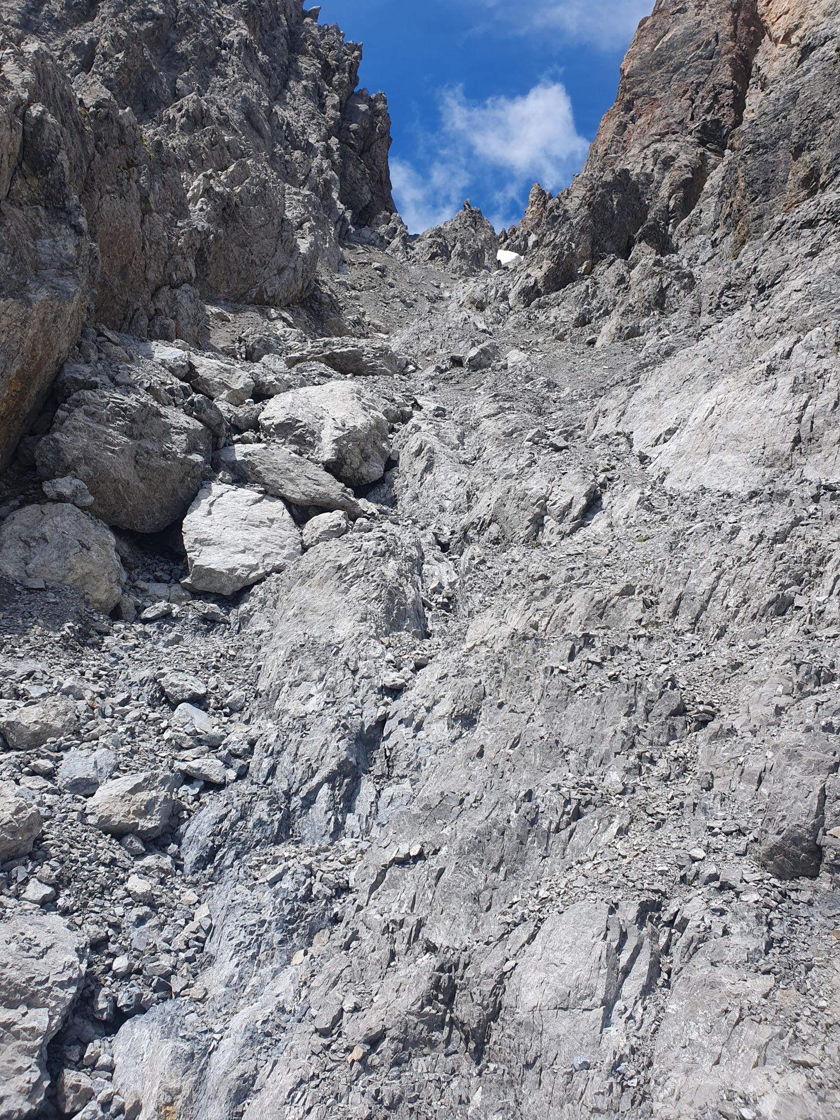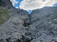 5. Ab hier Nördlich das Couloir um ca. 50 Meter hochsteigen. Mittig das Geröll etwas rechts auf Felsen ausweichen.