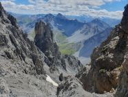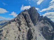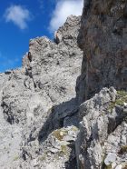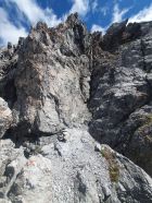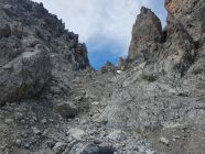 7. Beim Ausstieg dieser Rinne kann der Westgrat direkt erklettert werden (II) oder noch einfacher; man steigt ein westliches Couloir auf der anderen Seite im Schutt wieder hinab bis es sich stark einengt; hier über einen guten Fels (I) erreicht man das Westcouloir über einen Schutthang noch einfacher.