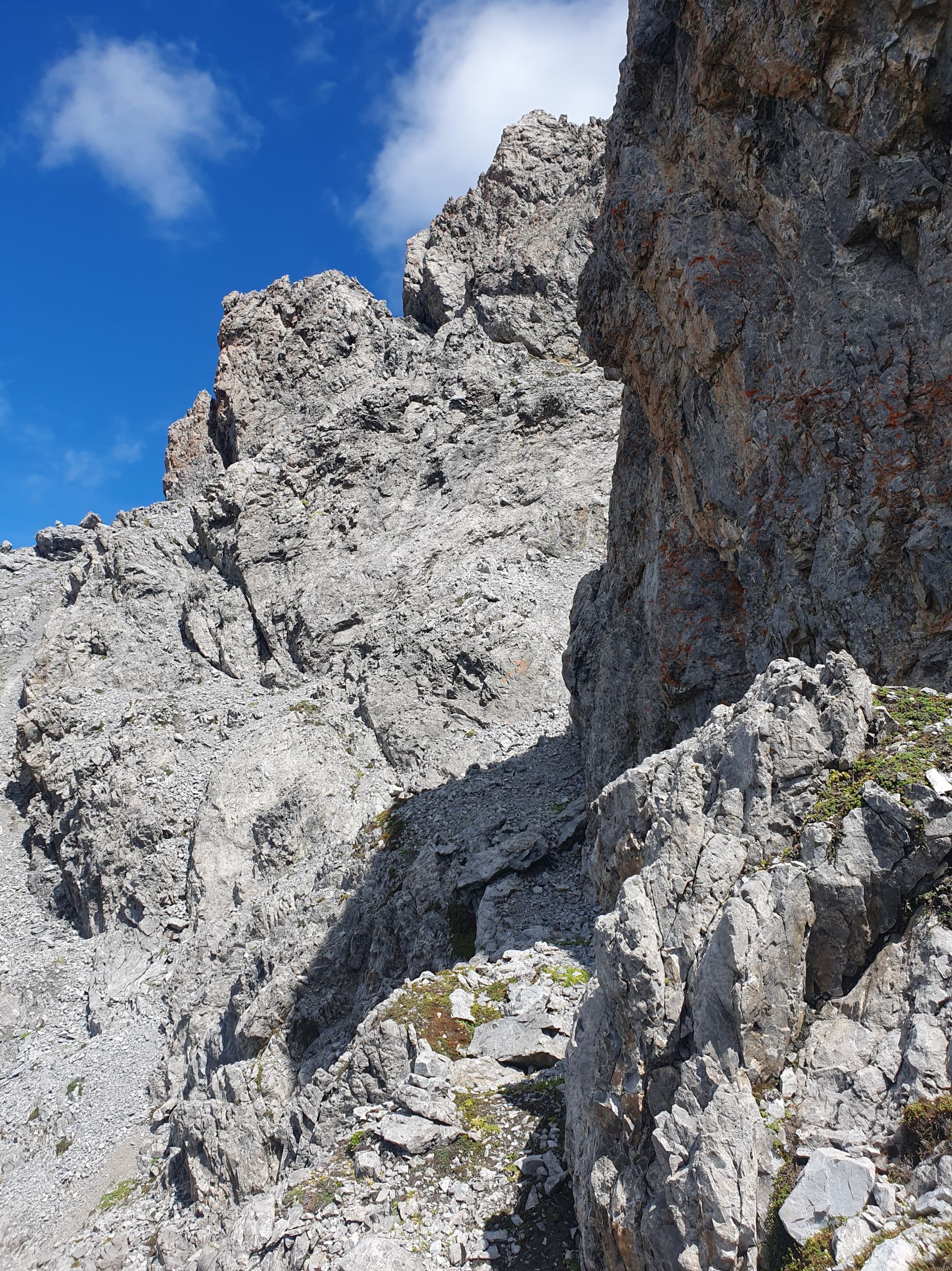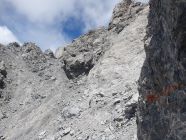 4. Ab hier NICHT nördlich versuchen hoch zu klettern. SONDERN in westlicher Richtung kurz absteigen und auf einem Band, der mit Steinmänner geschmückt ist, wieder hochsteigen.