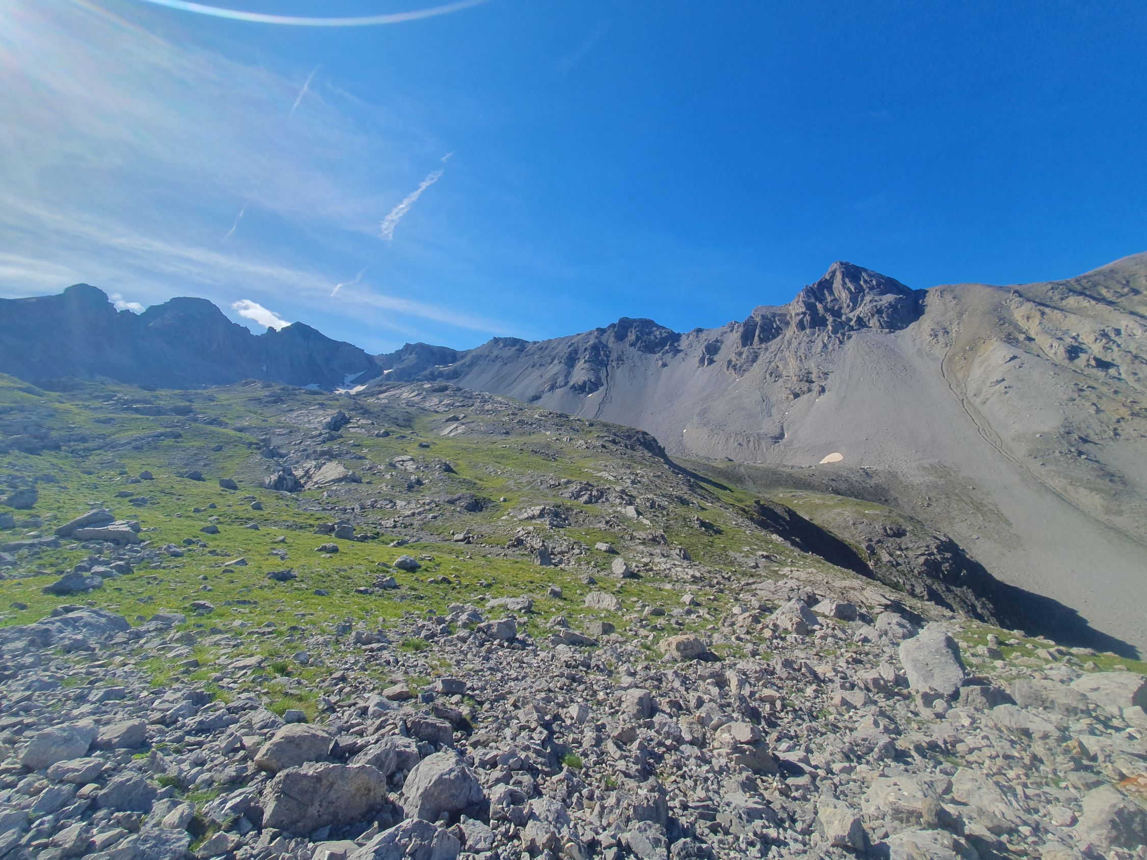 Ab hier ca. 200Hm hinabsteigen, bis man einen klar erkennbaren Pfad nach rechts trifft. Dieser Pfad ist sehr nützlich, denn es überquert doch noch ein paar Steile Rinnen... Sobald man vor einem langen Geröllfeld steht macht es Sinn auf der Wiese hinab zum Bach bei Gravas abzusteigen.