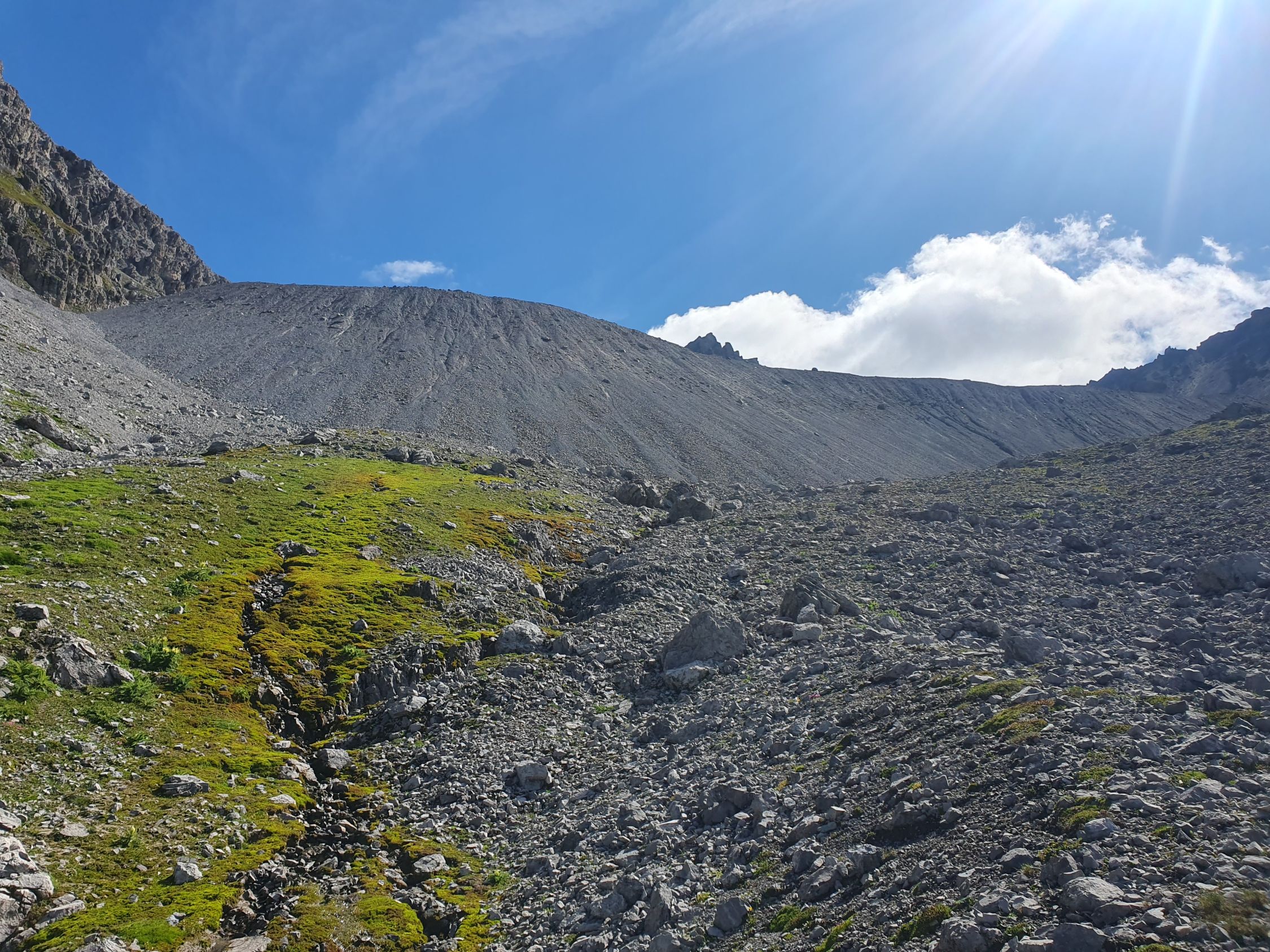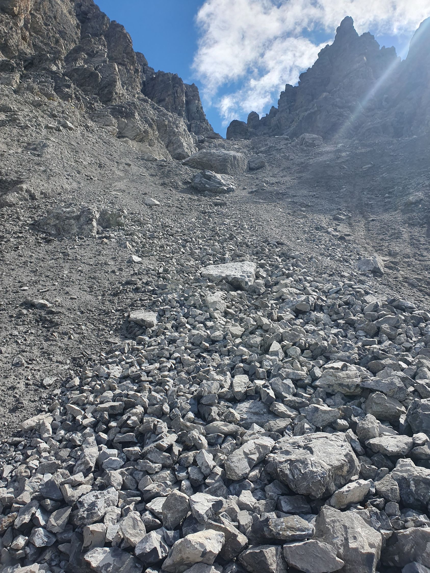 Diese Traverse war aber dennoch mühsam, da das Geröll sich immer abwechselte, mal rutschte man mit, mal war es hart etc... Zudem muss man unzählige Murgange traversieren, was nicht immer einfach war.