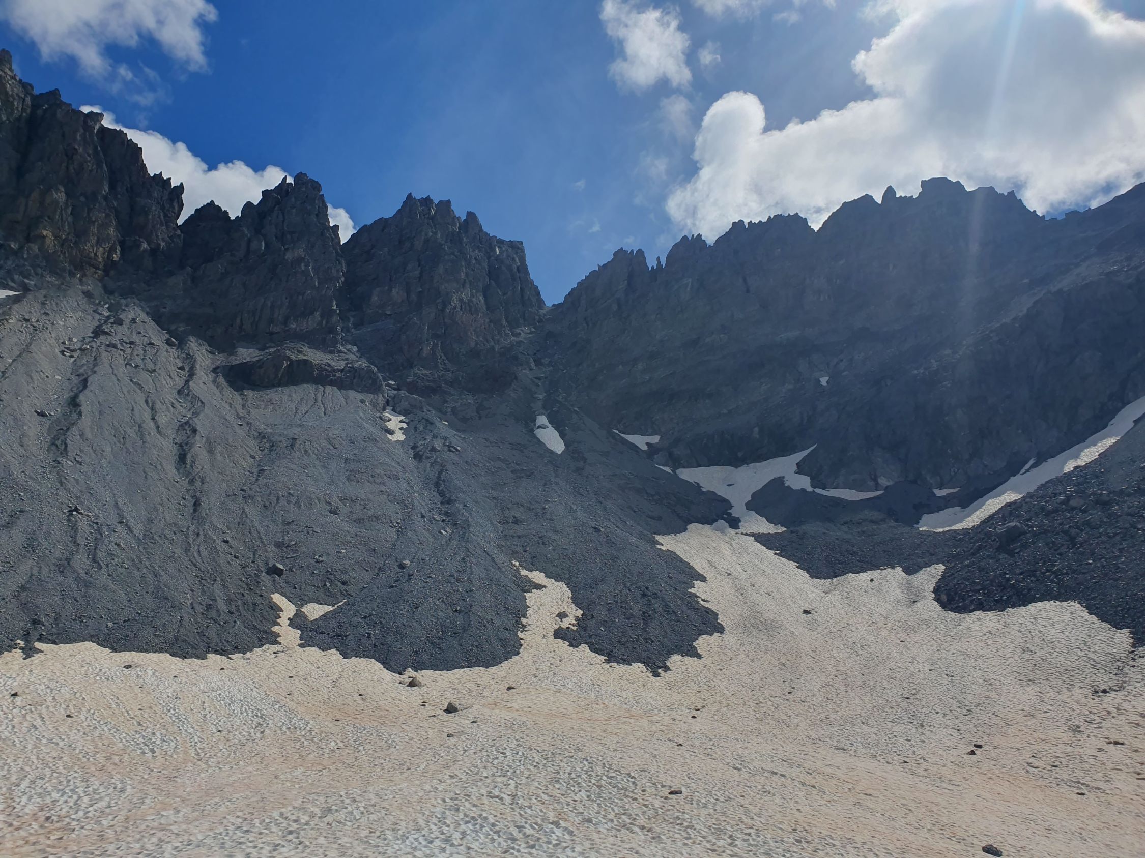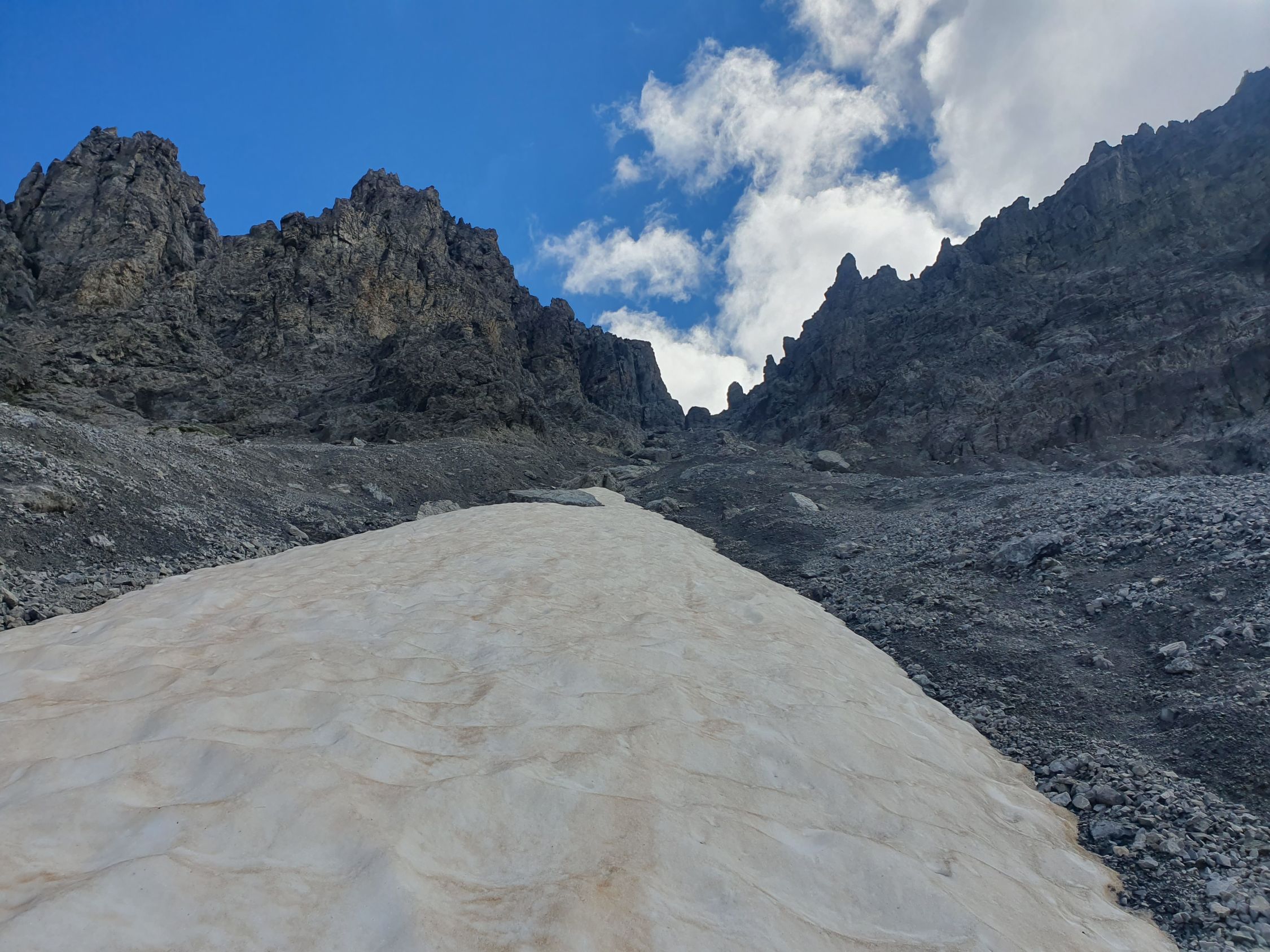 Es kann ohne Schneekontakt im Westcouloir hochgestiegen werden. ABER auf Wunsch hat es im südlichen unteren Bereich und später kurz mittig ein paar Restschneefelder (bis ca. P2810), die ich auch liebend gerne nutzte, da ich Schnee lieber mag als Schutt.