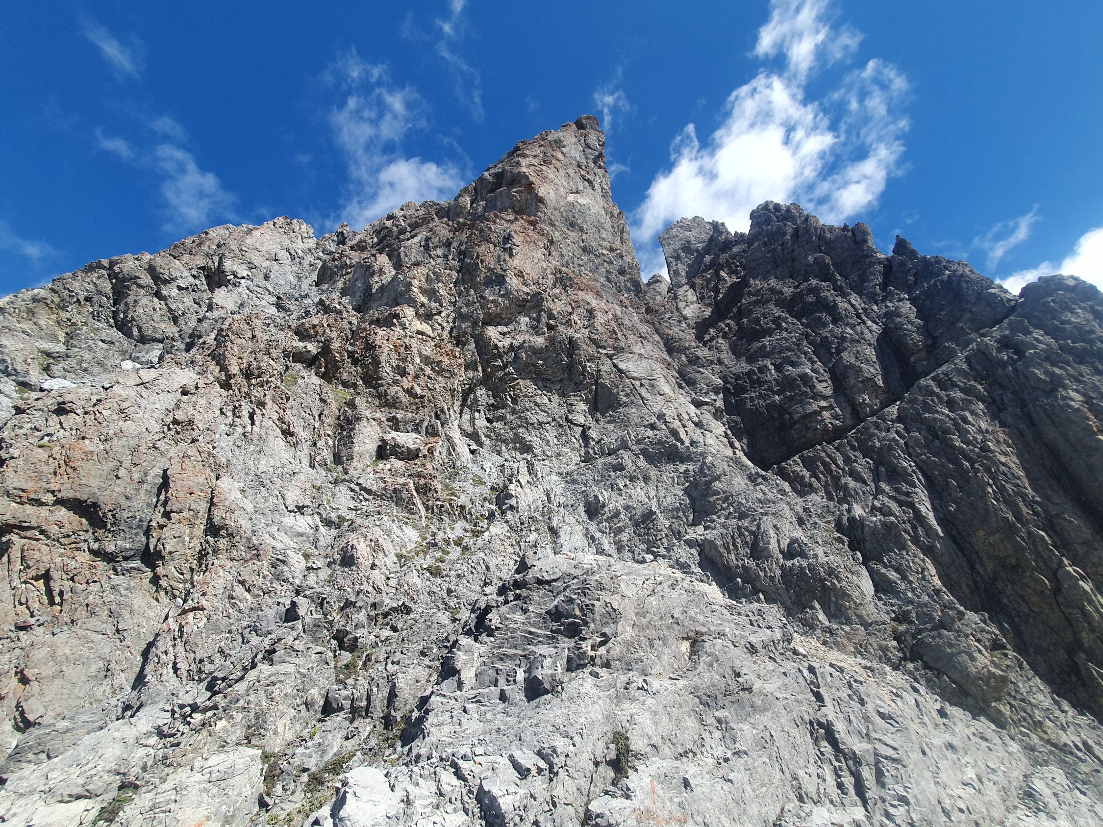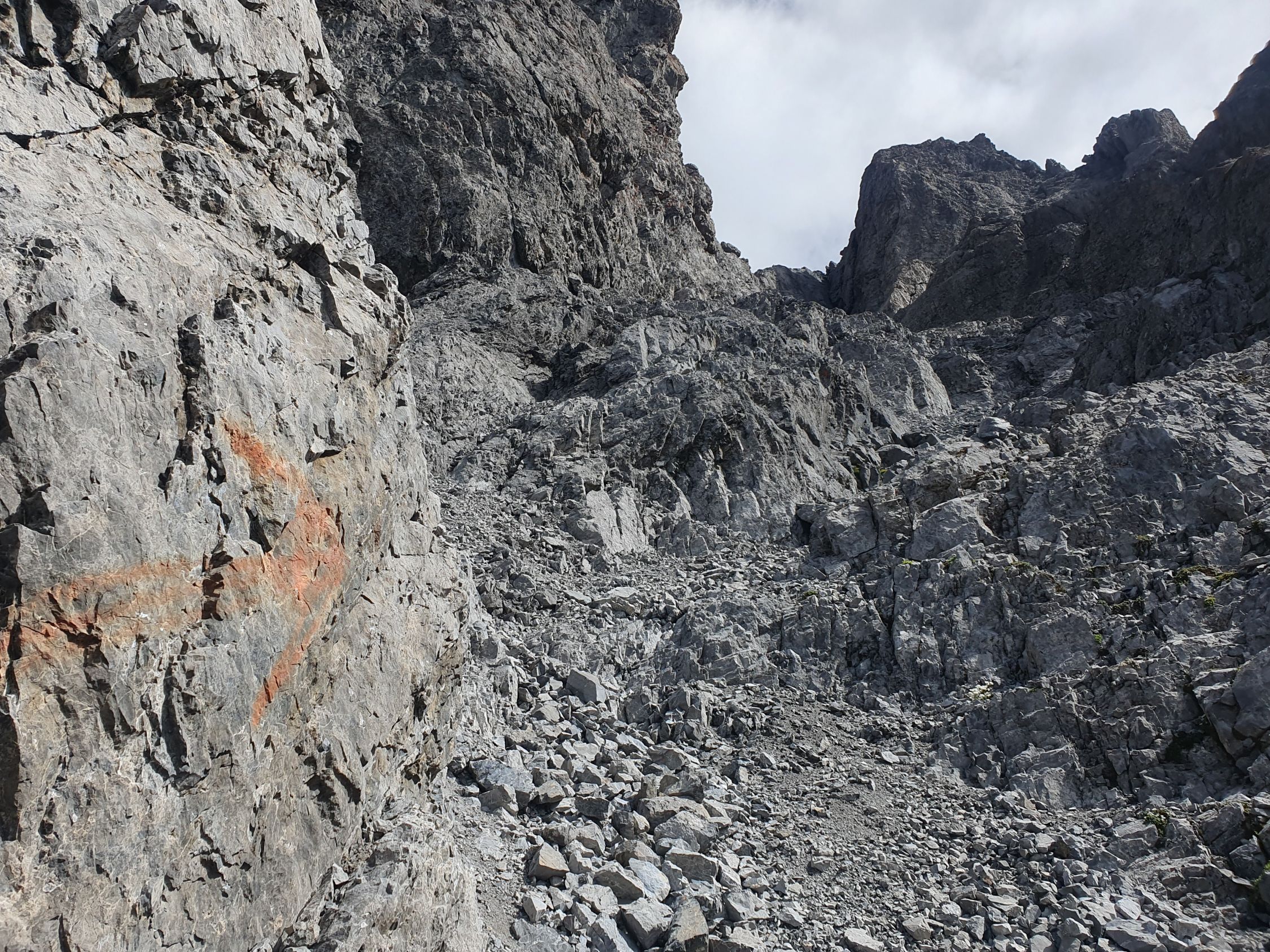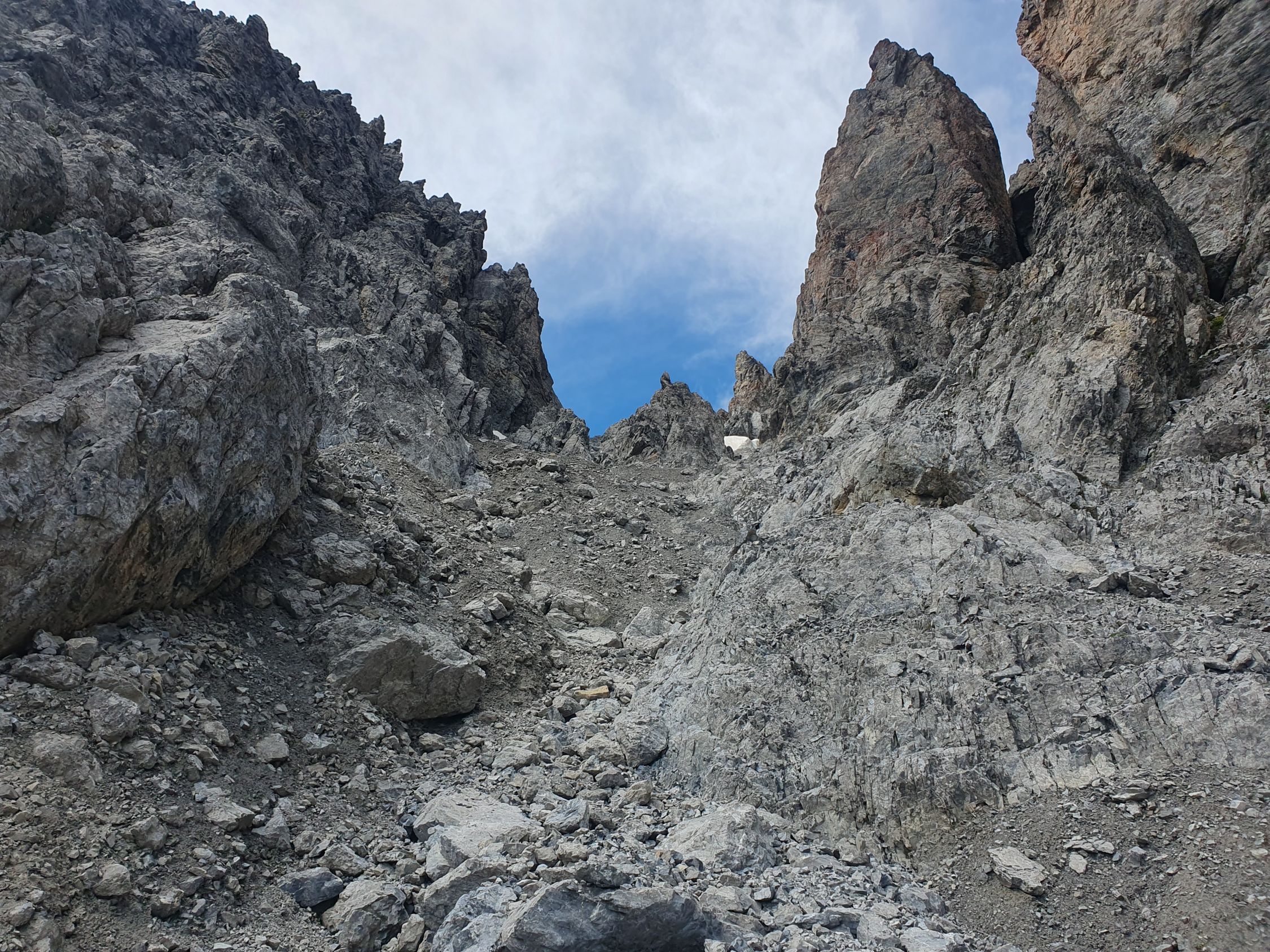 Ab da steigt man nach Osten hoch nördlich von P2532 vorbei bis zu einem Schutthügel (P2745), der am besten nördlich umgangen wird. Nun hat man eine gute Einsicht in die Westrinne.