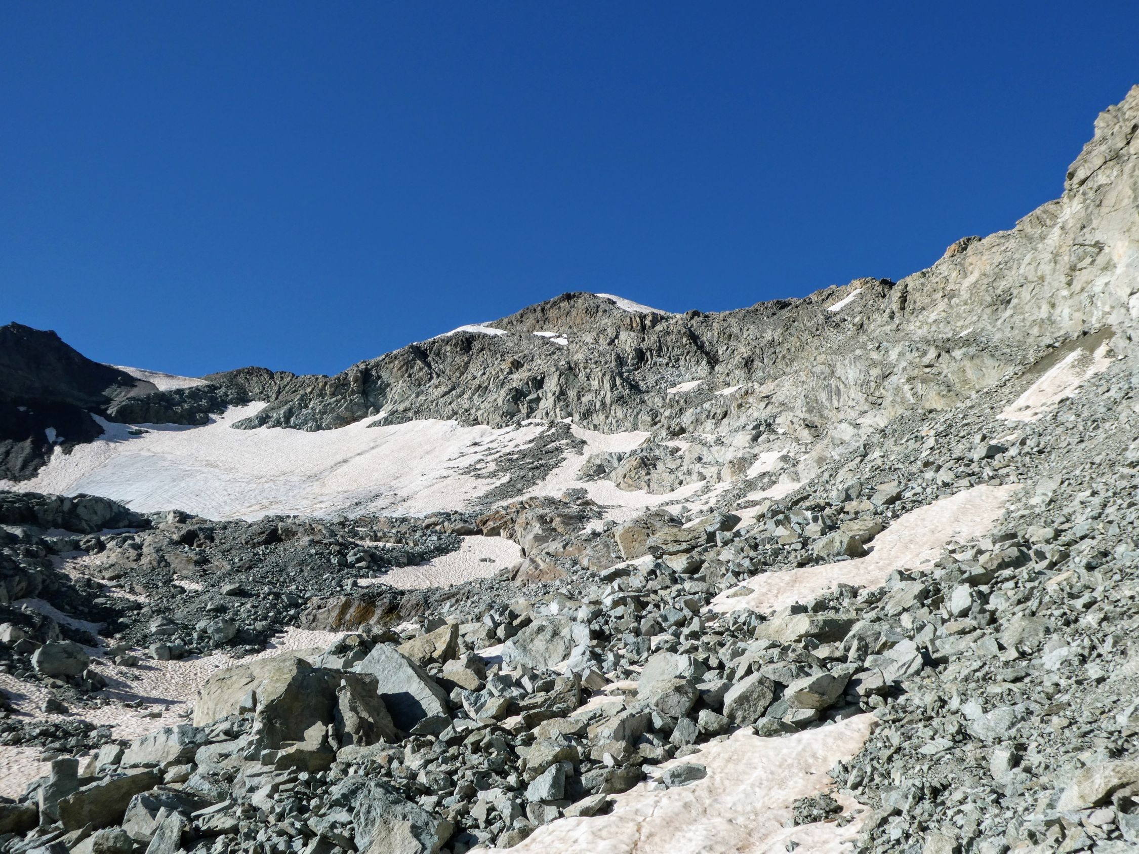 Wer den Gletscher nicht betreten will, kann diesen auch westlich über ein Geröllfeld und eine Rampe umgehen und direkt zum Pkt.3110 aufsteigen.