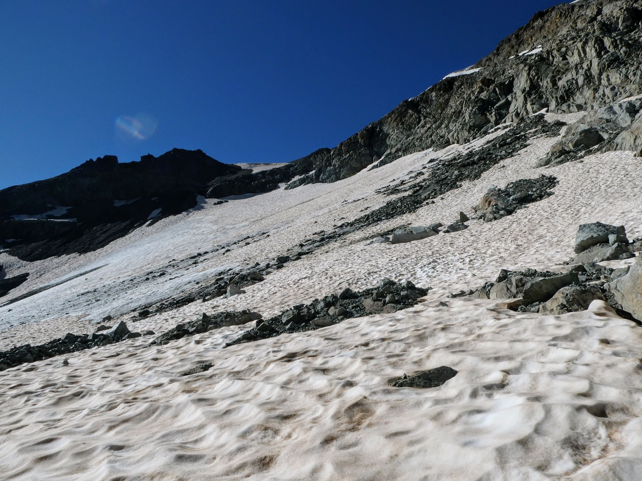 Der kleine Gletscher ist zwar noch überwiegend schneebedeckt, doch etwas Blankeis war auch zu queren. Die Steigeisen waren kein Luxus, zumal der Gletscher im oberen Teil immer steiler wird.