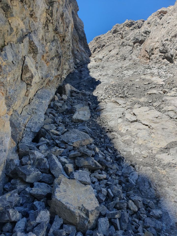 In der zweiten Rinne "Ostrinne" wieder viel angenehmer hochzusteigen, obwohl das Geröll mir manchmal wie ein Laufband vorkam; d.h. ich lief, kam aber nicht forwärts... Da spührte ich schon meine müden Beine von gestern... Auf die Zähne beissen und weiter bis zur Schlüsselstelle der zweiten Rinne (III): Ein paar Steinbrocken blockieren die Rinne, so, dass man nicht über die klettern kann. Hier muss auf der rechten Seite ein mühsamer feingeschliffener Fels hochgeklettert werden, um wieder links zurück zur Rinne zu kommen. Dieser Fels da hat an den rutschigen Rillen auch noch Sandschutt drauf. Ein Polieren von Hand und Fuss war nötig, sonst unmöglich....