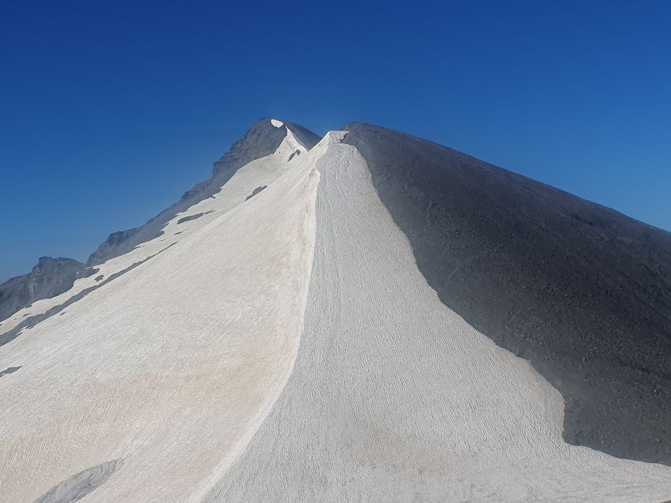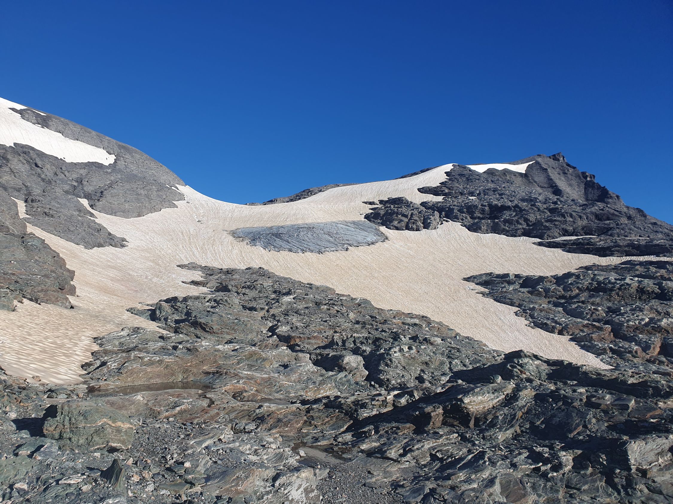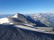 Gletscher nach Mittelgrat schneebedeckt (sowieso keine Spalten). Guter Trittschnee - ca. 100m zum Queren. Ein Fleck ist schon aper.