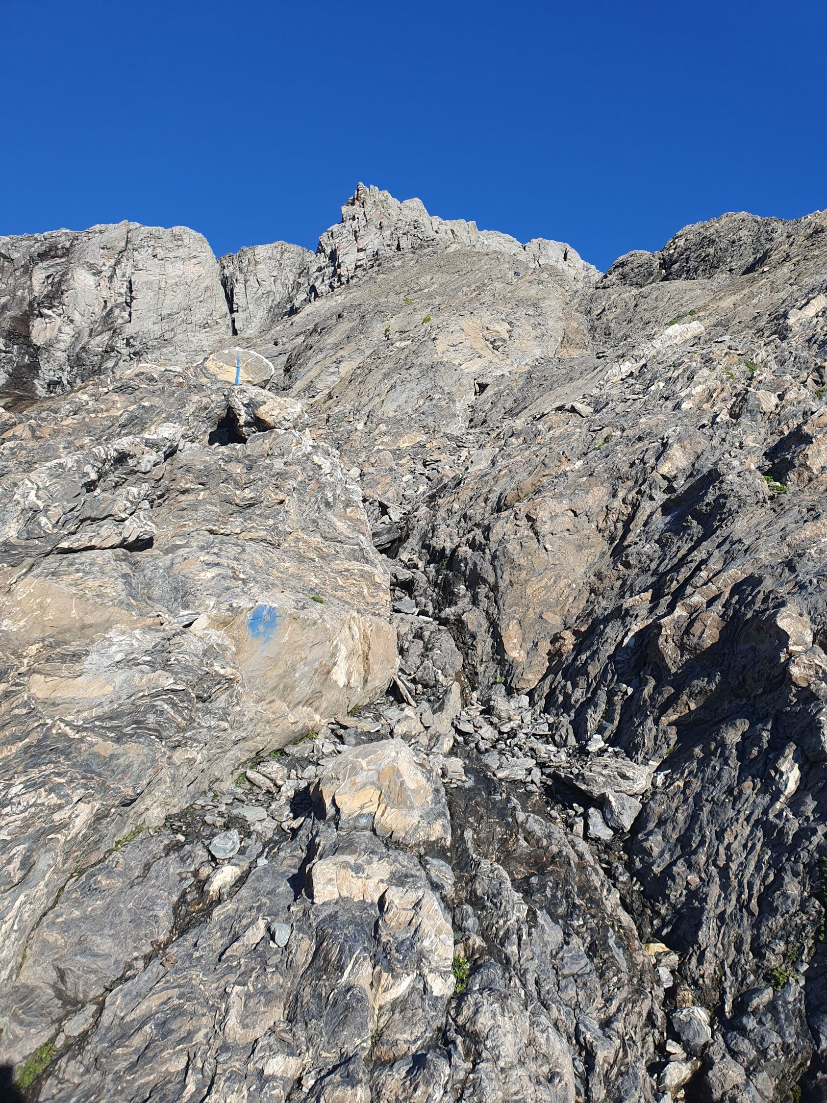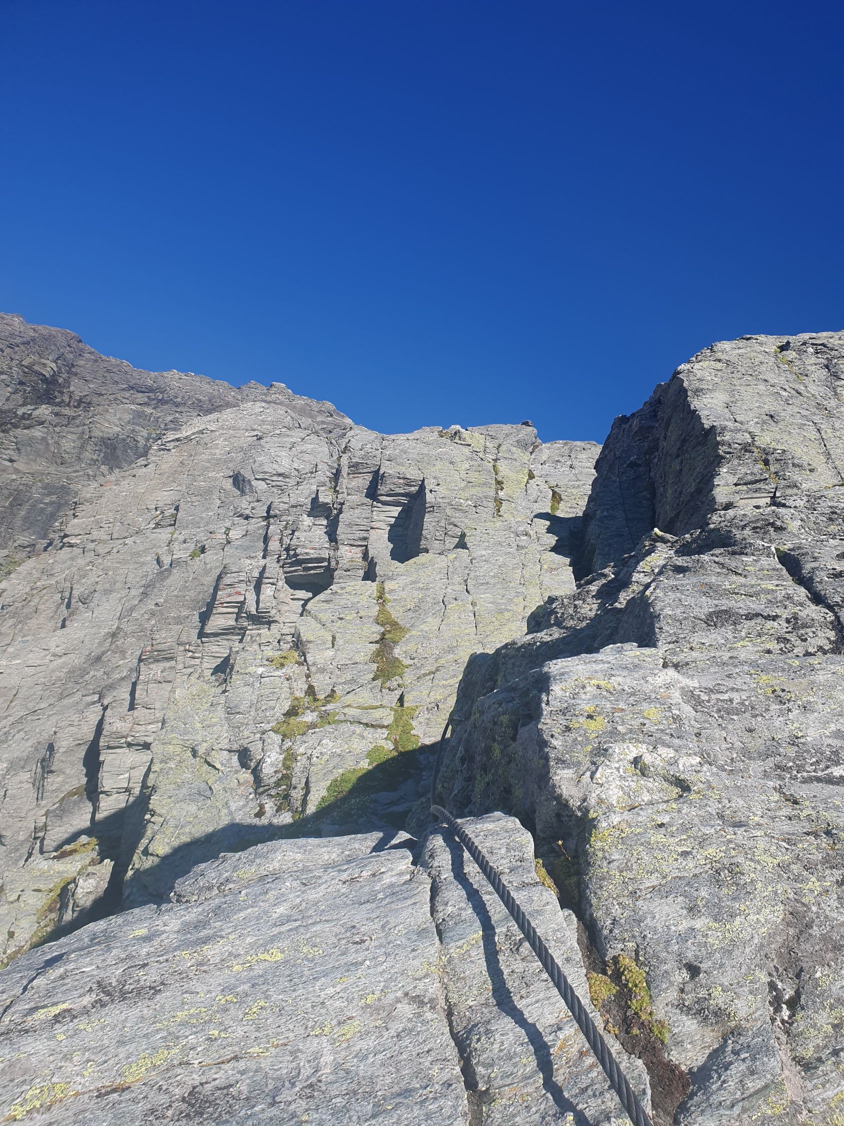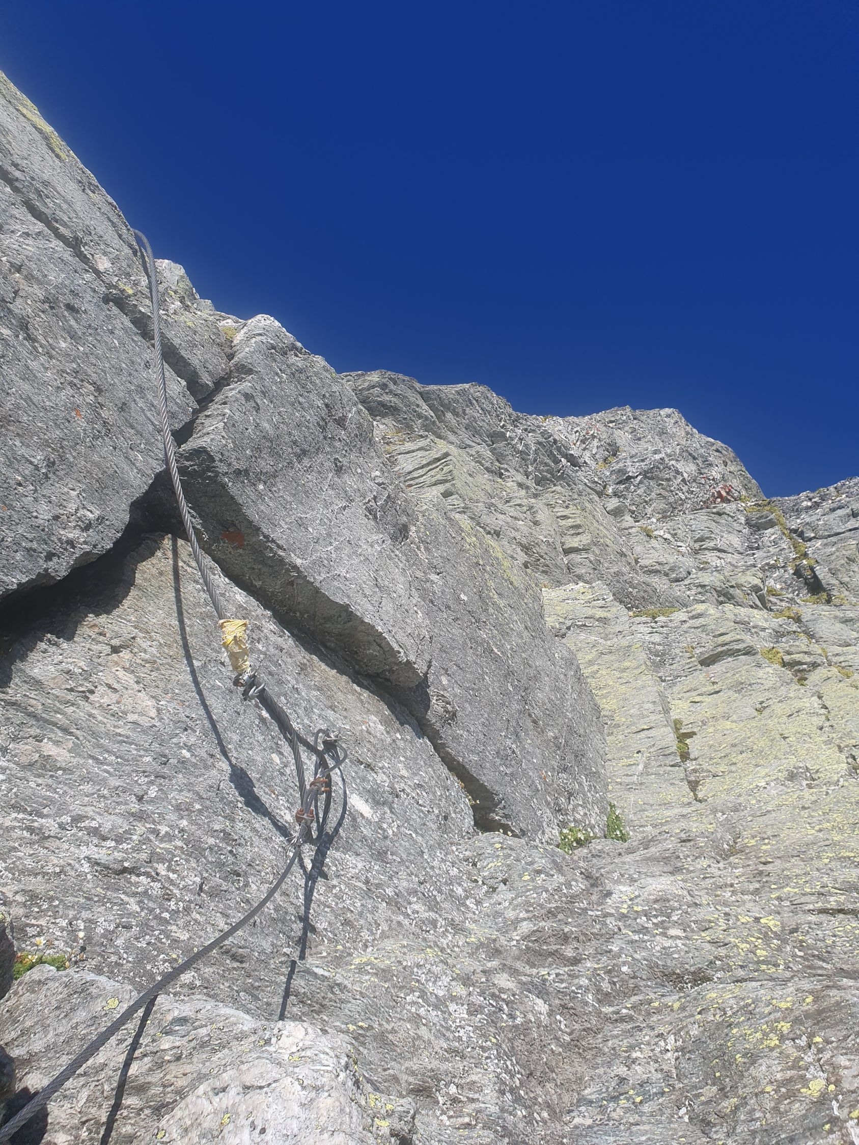 Der Mittelgrat ist wirklich gut abgesichert mit durchgehenden Stahlseil. Jedoch Fels teils brüchig.