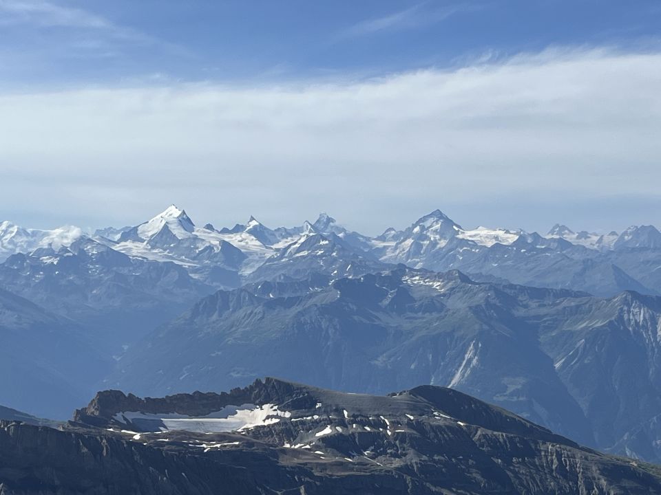 Platten am oberen Westgrat bereits alle angeschienen, warm und trocken. Am Gipfel um 10:30, tolle Fernsicht. Leider Steigeisen und Pickel vergessen, sonst hätte der Weg zum Balmhorn noch mit passablen Firn gelockt.
