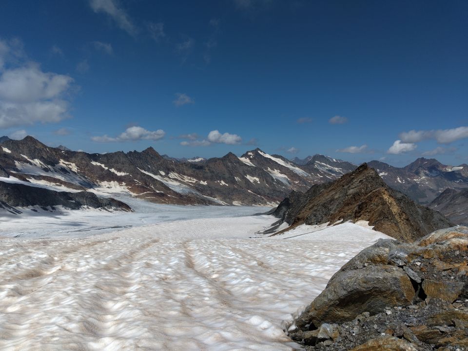 Gletscher aper bis Annajoch. Dan etwas Schnee. Verhältnisse gut.