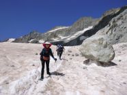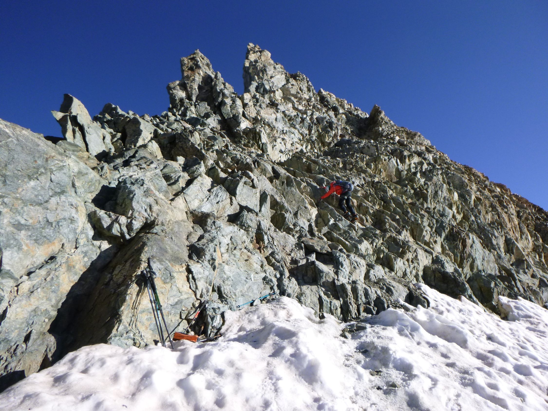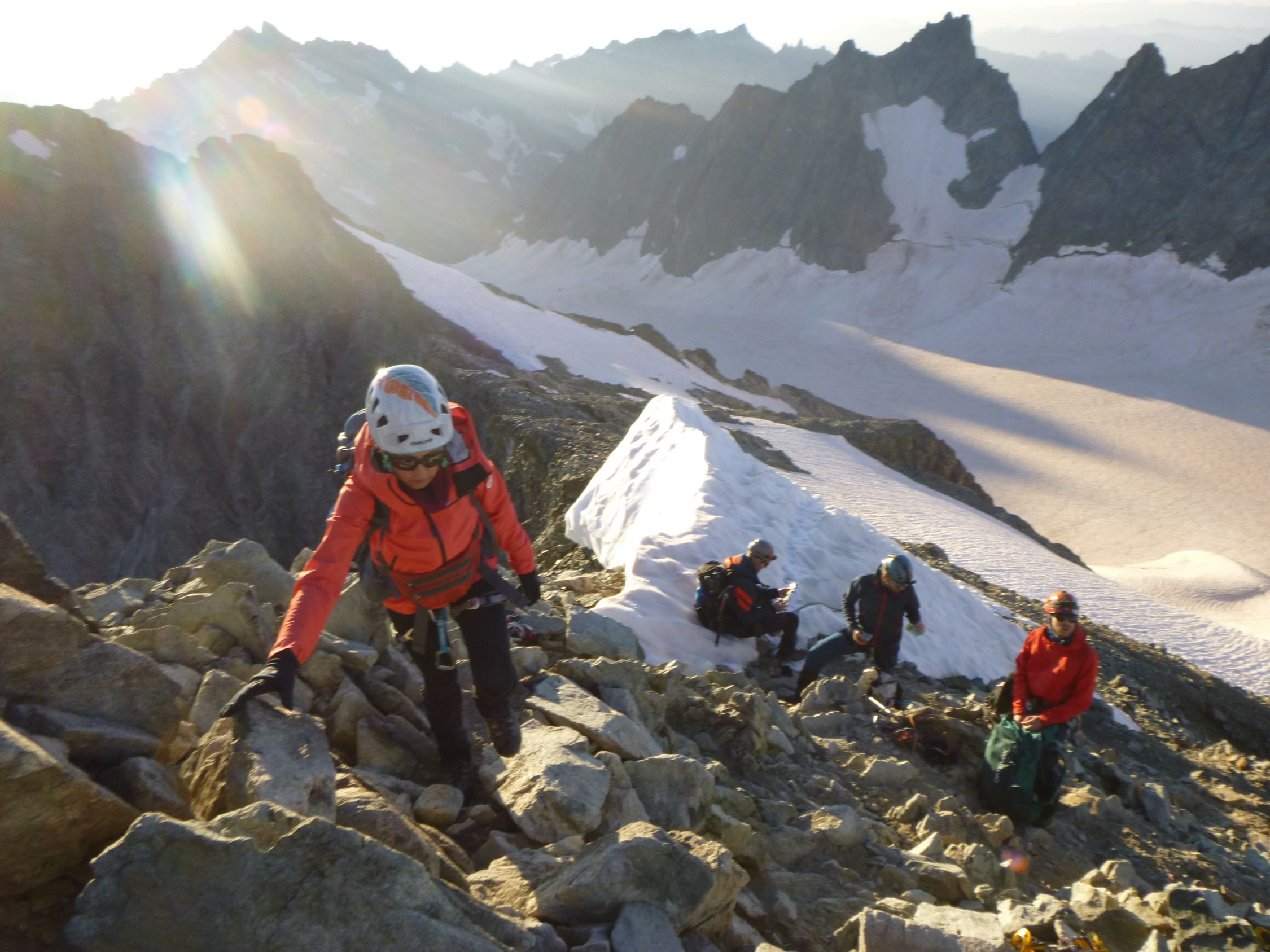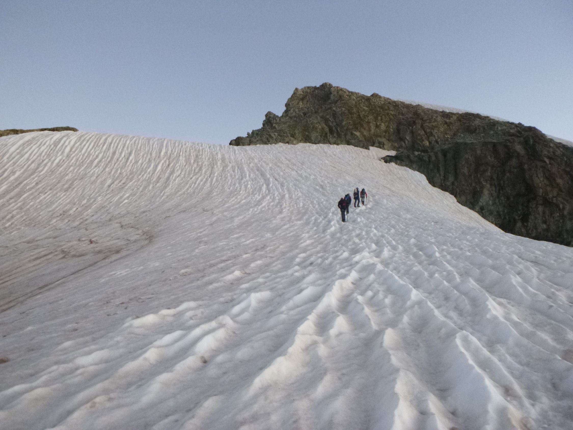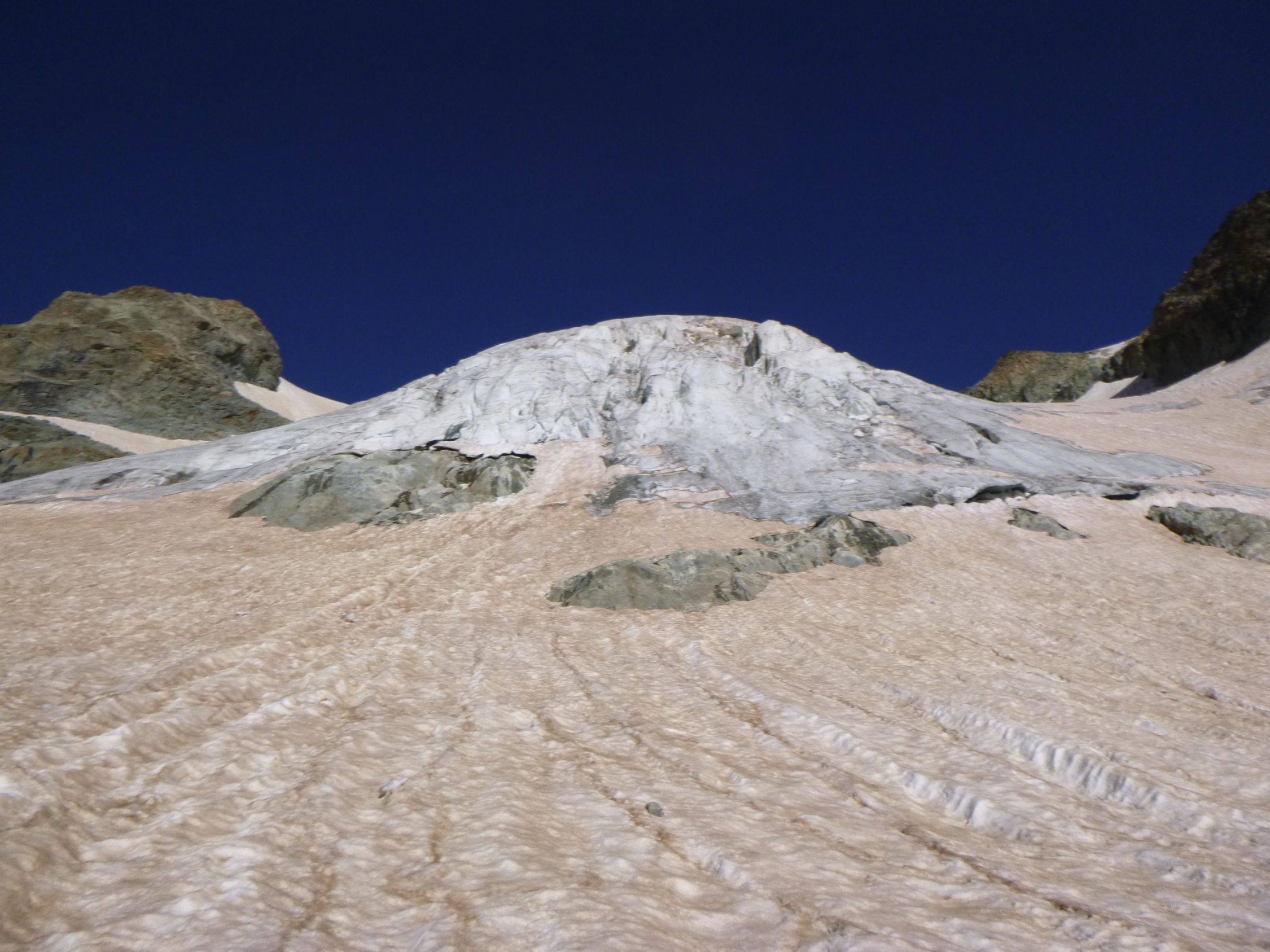Beim Aufstieg zwischen Gletscherabbruch rechts und Felsen P 3558 links gibt es keine Spalten, so dass man seilfrei laufen kann.