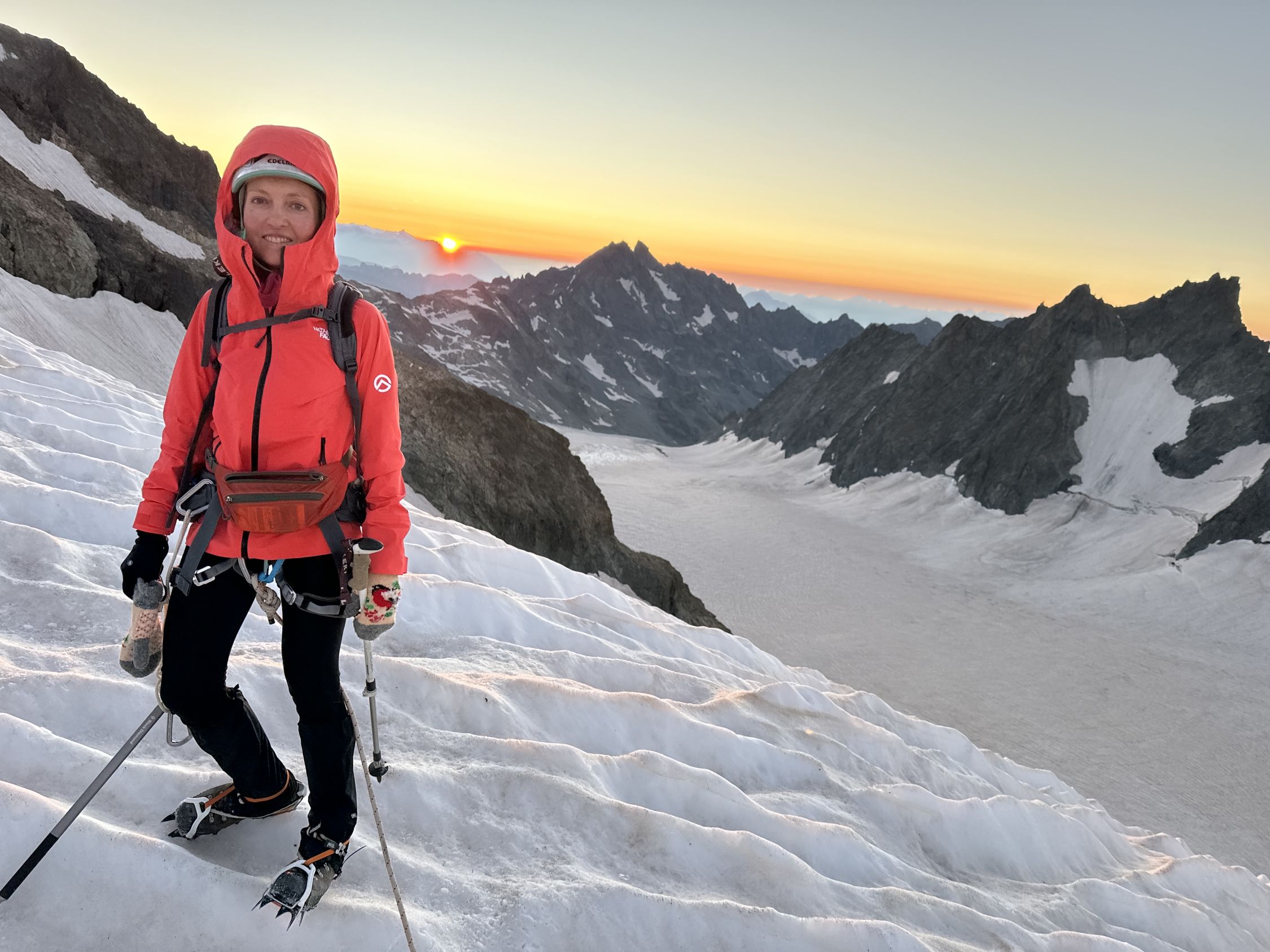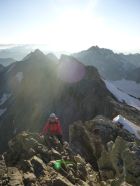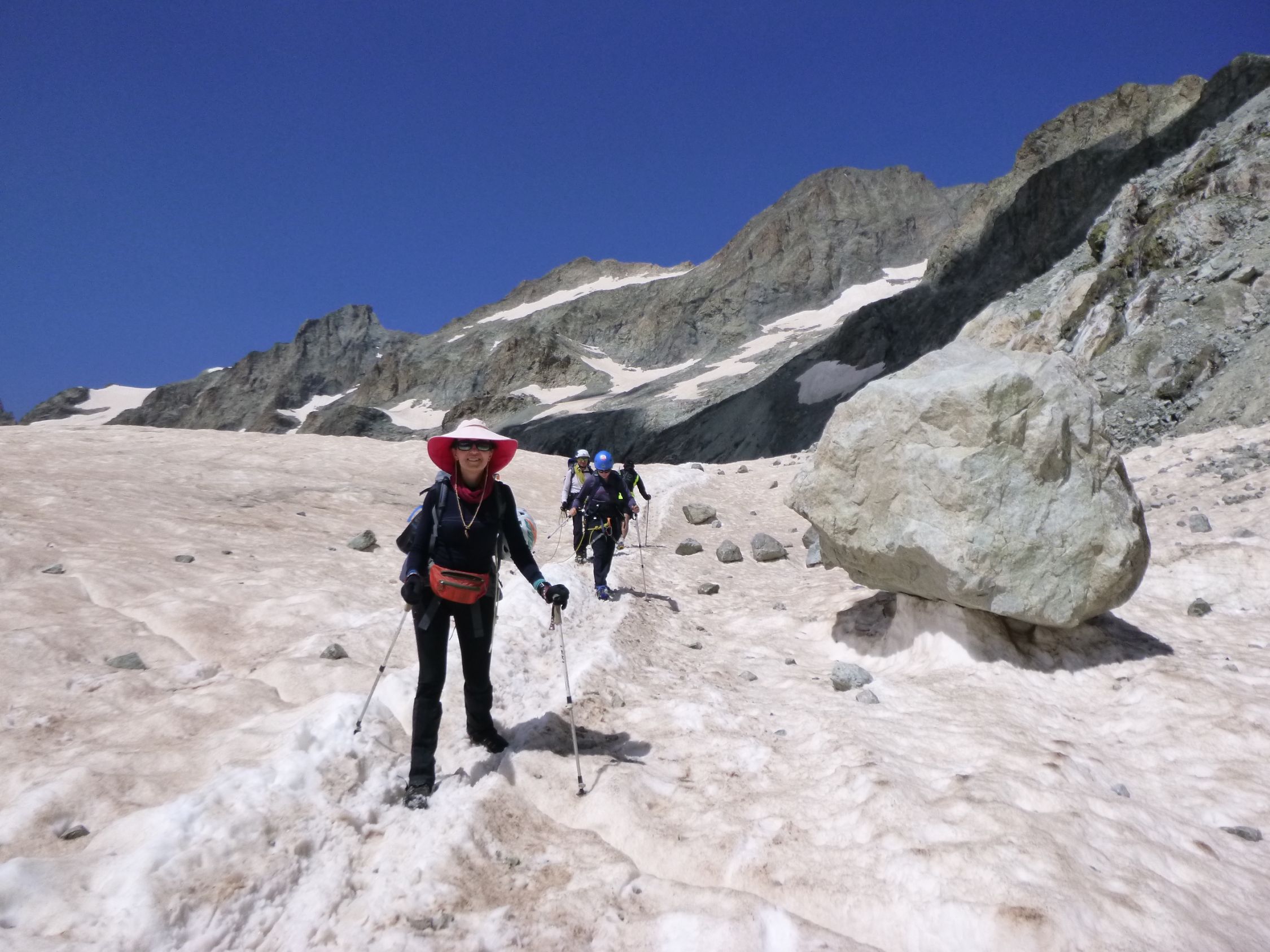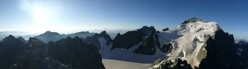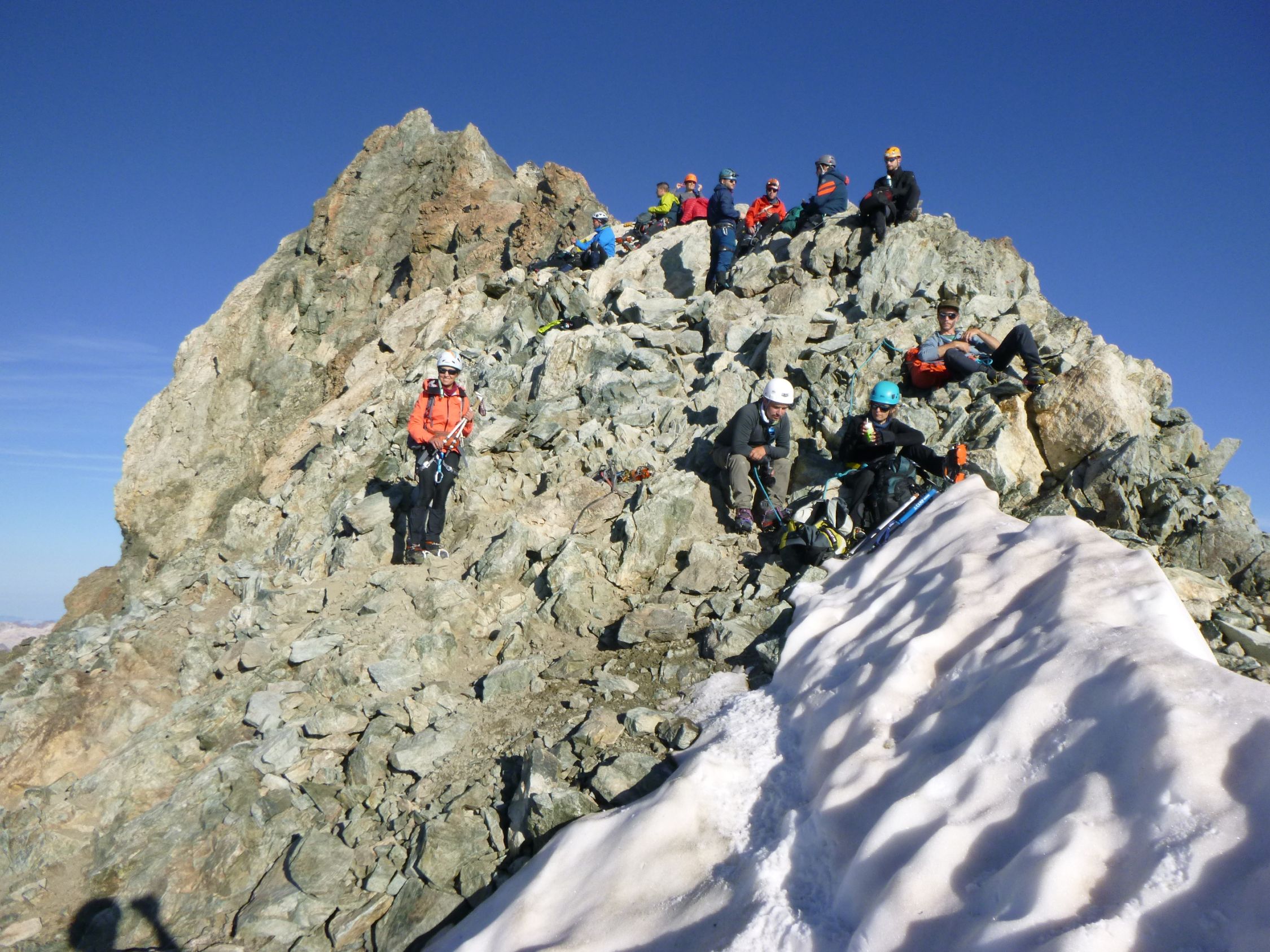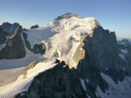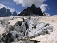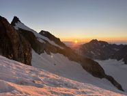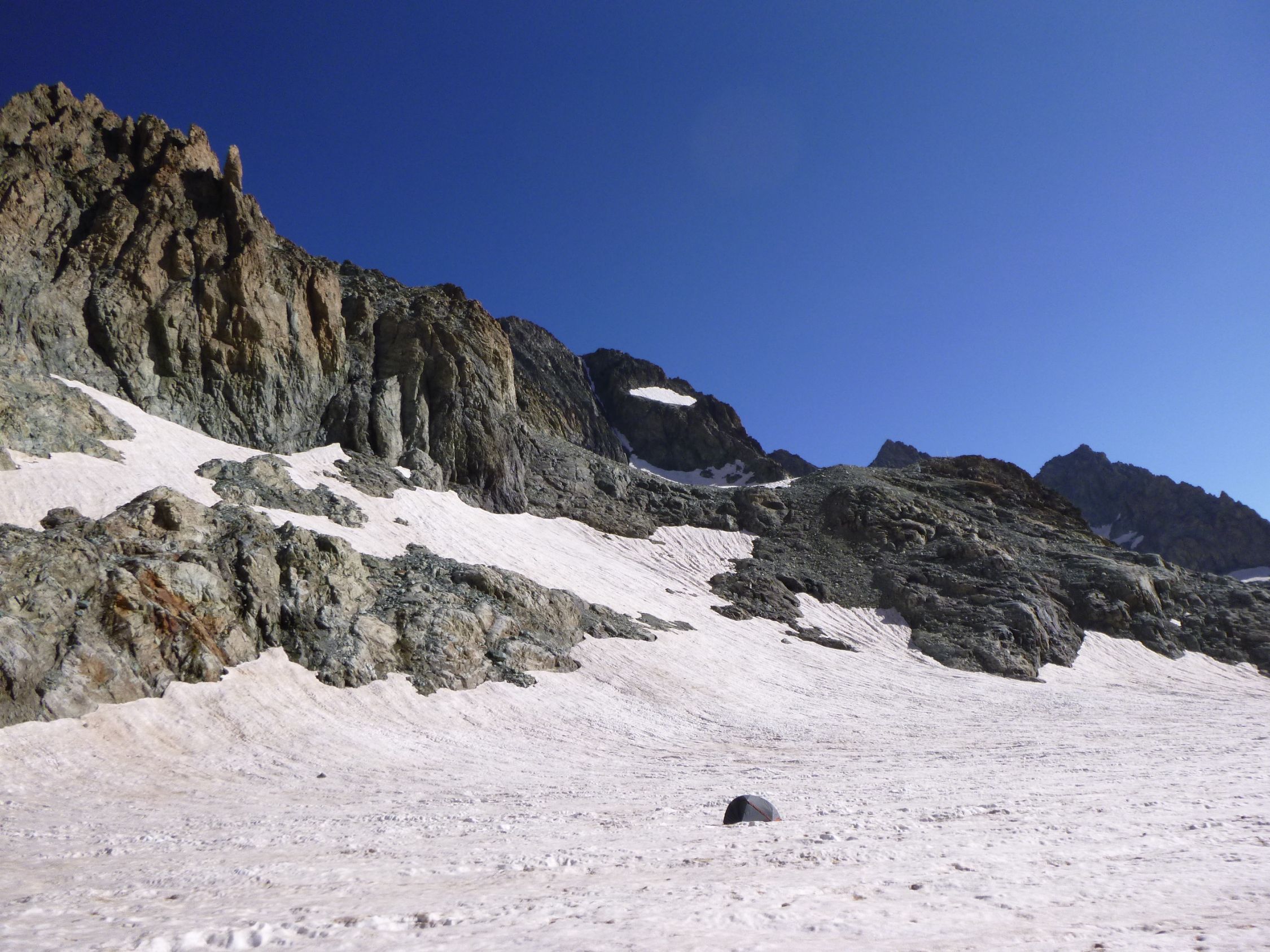 Beim Aufstieg zwischen Gletscherabbruch rechts und Felsen P 3558 links gibt es keine Spalten, so dass man seilfrei laufen kann.